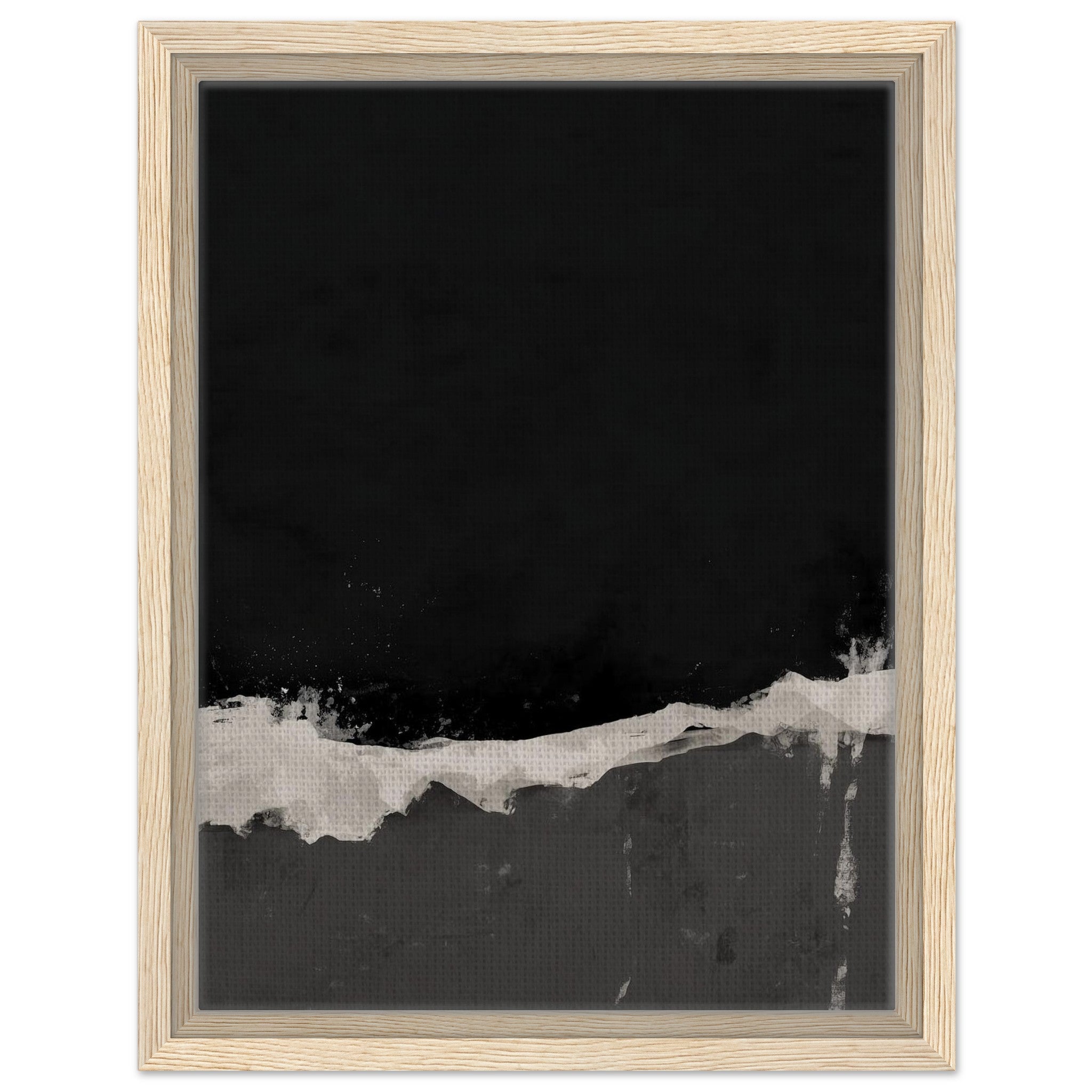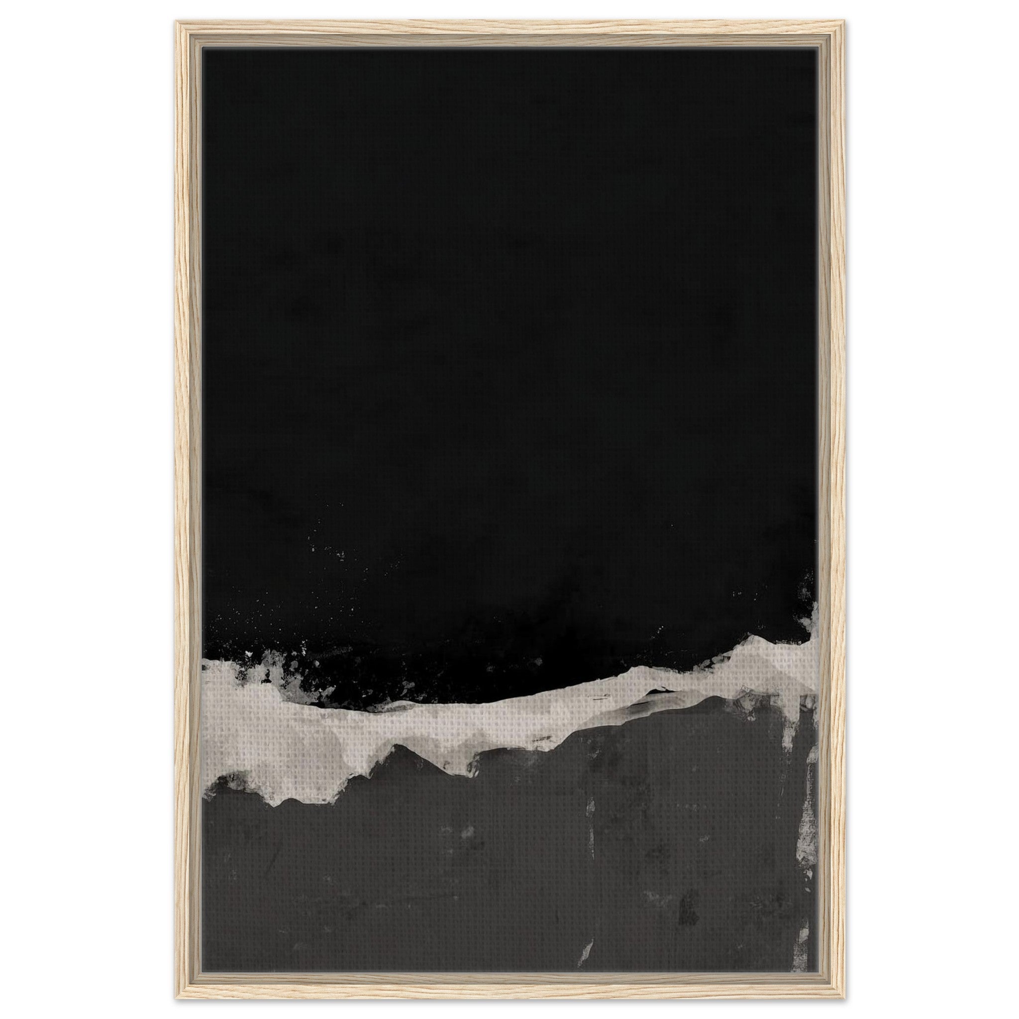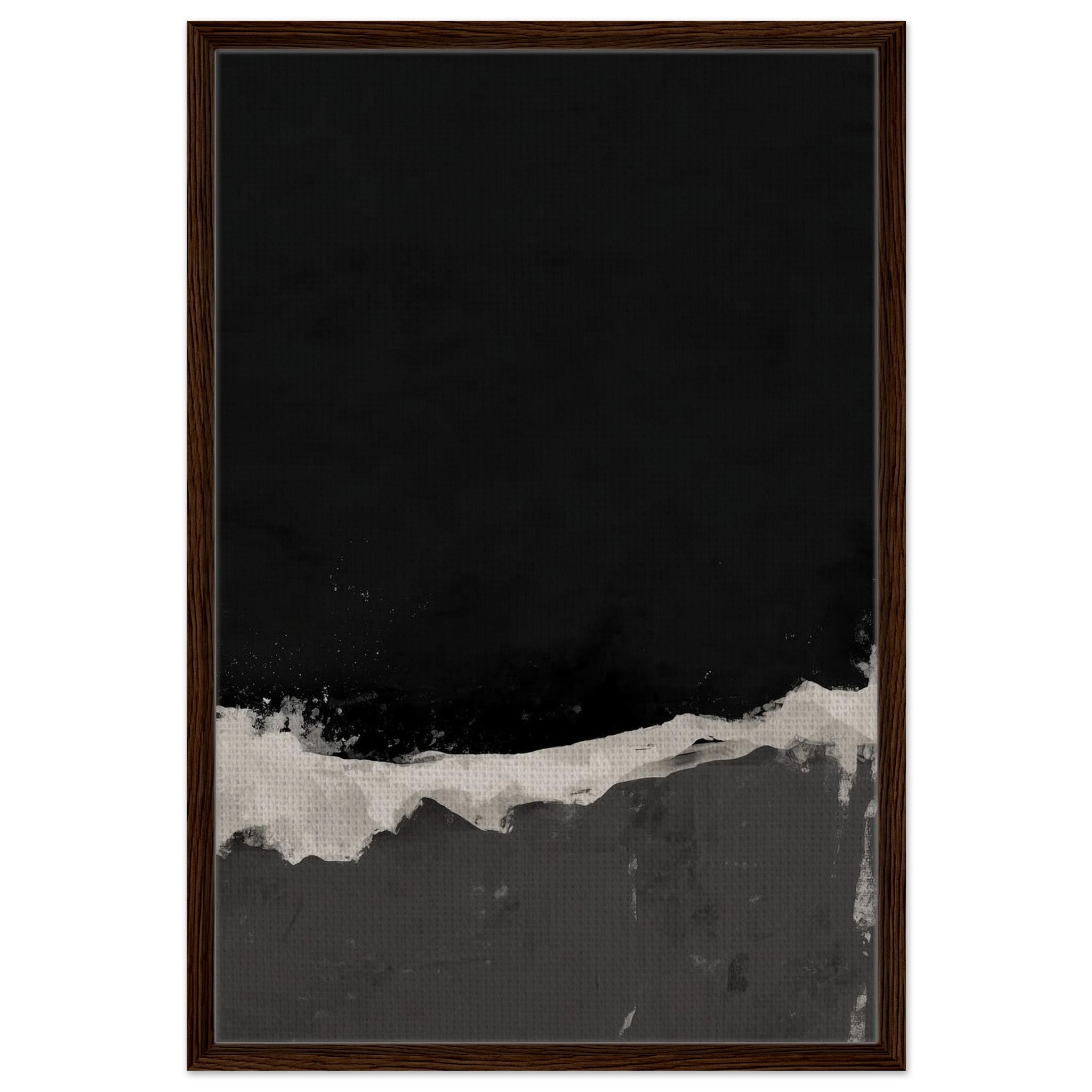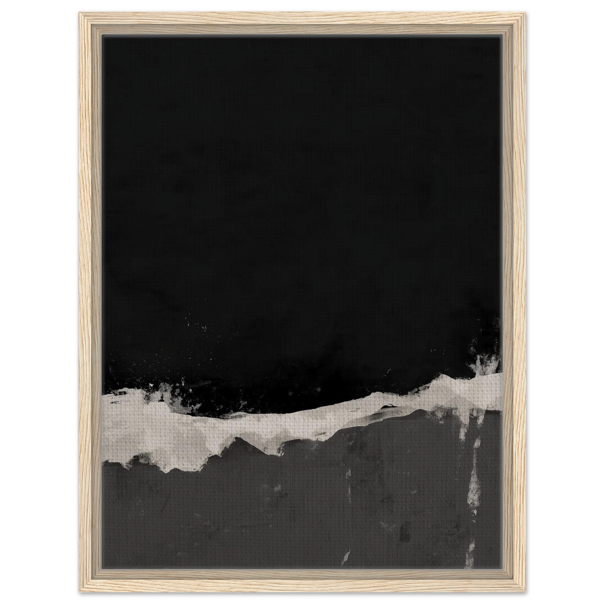 Das Midnight Horizon Leinwandbild zeigt eine dunkle Fläche in Schwarz, die auf eine helle Linie trifft. Darunter liegt eine graue Zone, die Tiefe und Struktur verleiht. Das Motiv erinnert an eine Küste in der Nacht oder an eine stille Landschaft im Mondlicht.