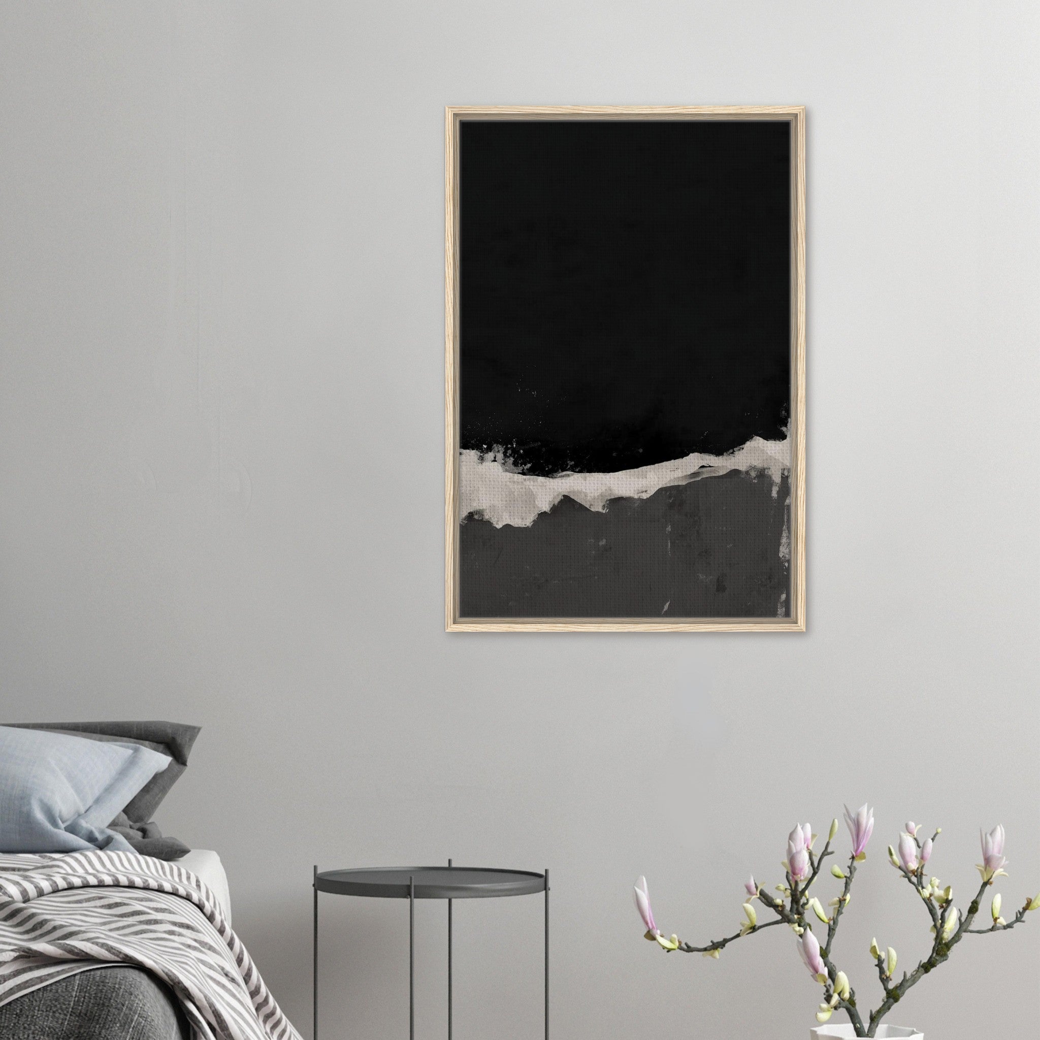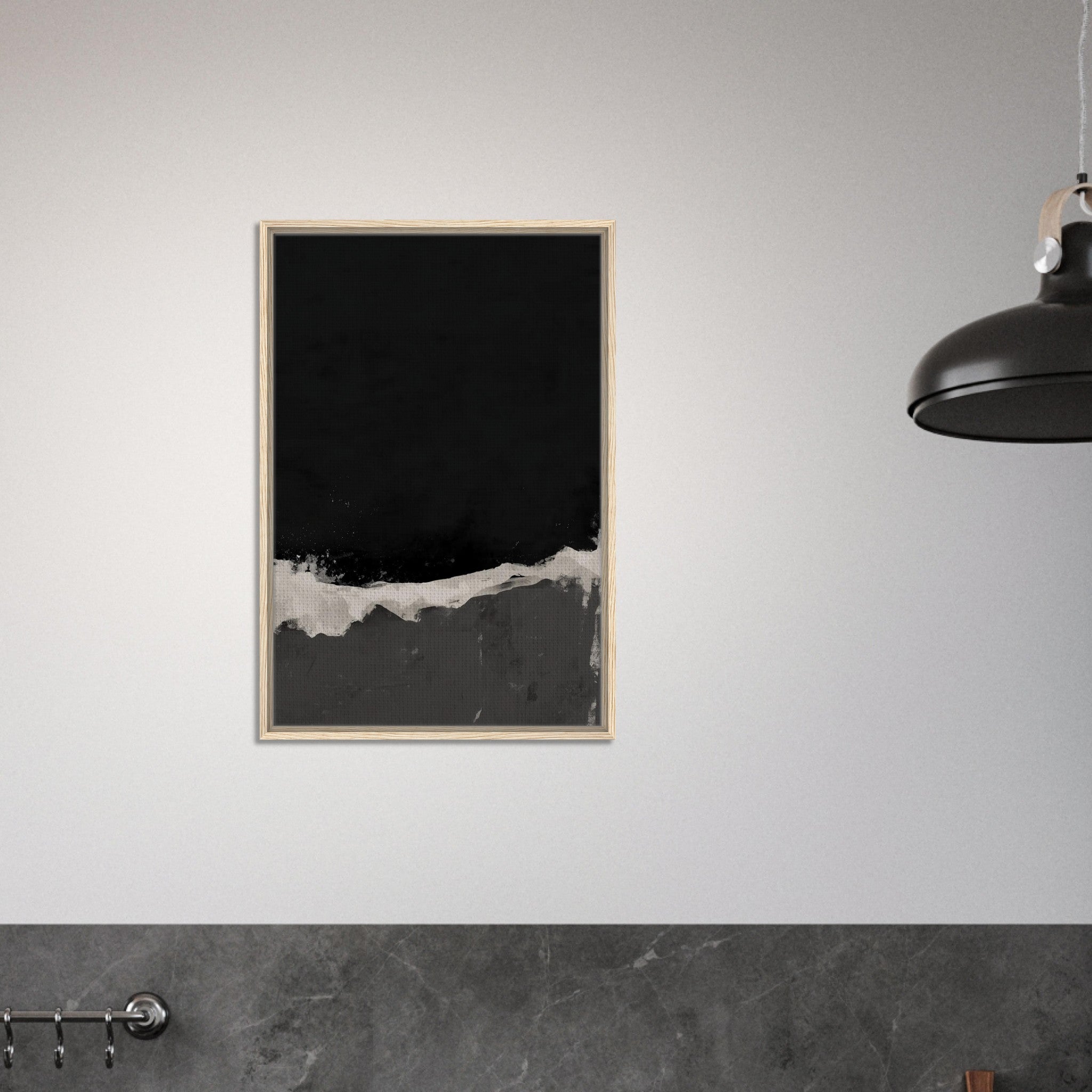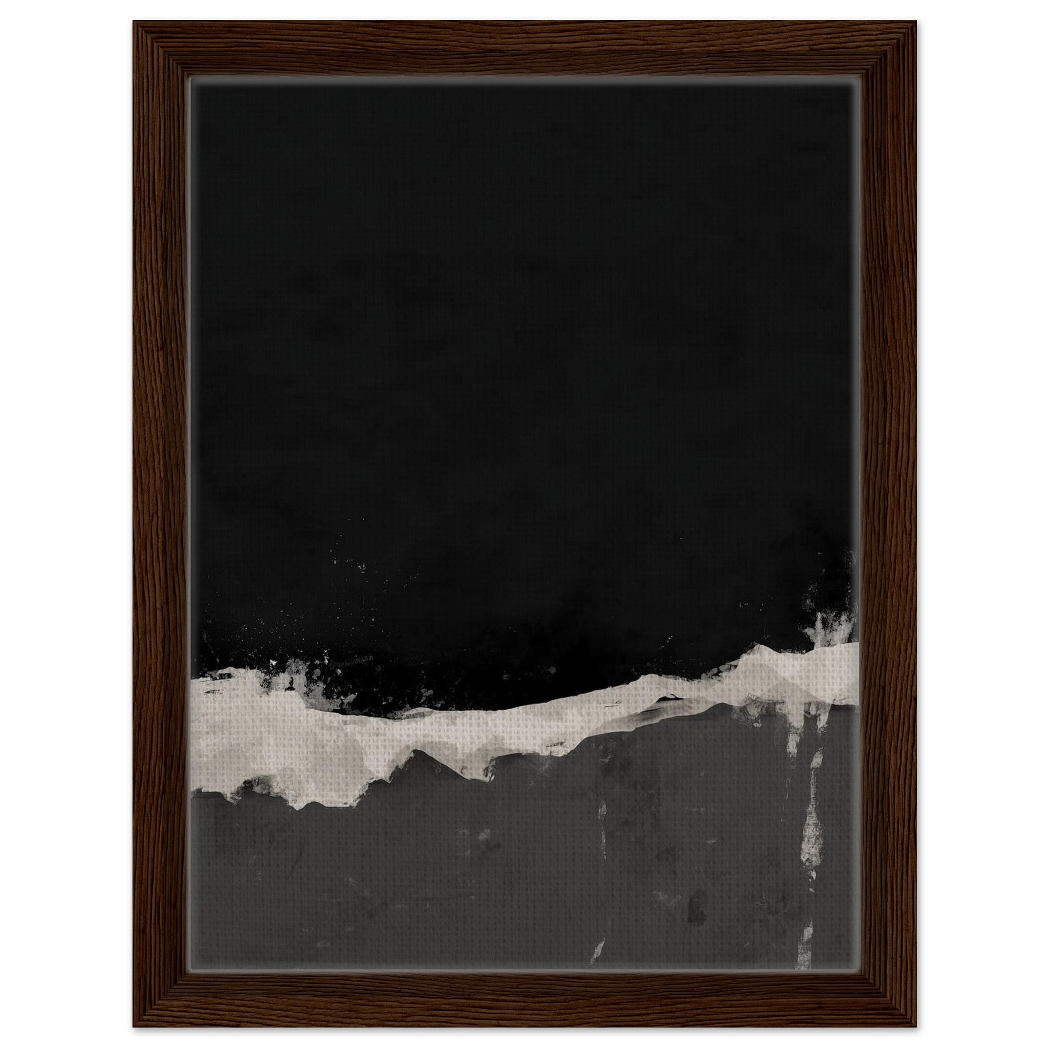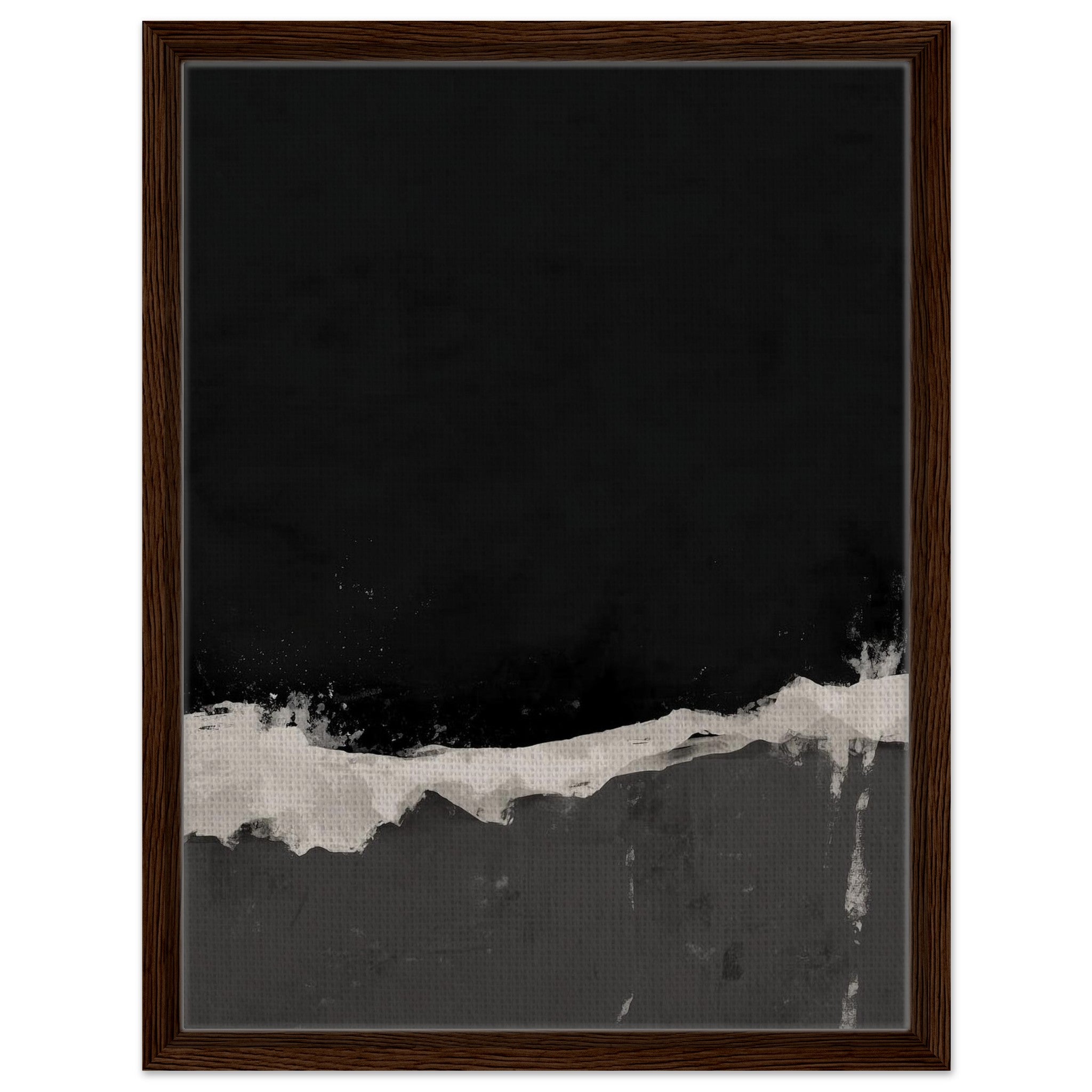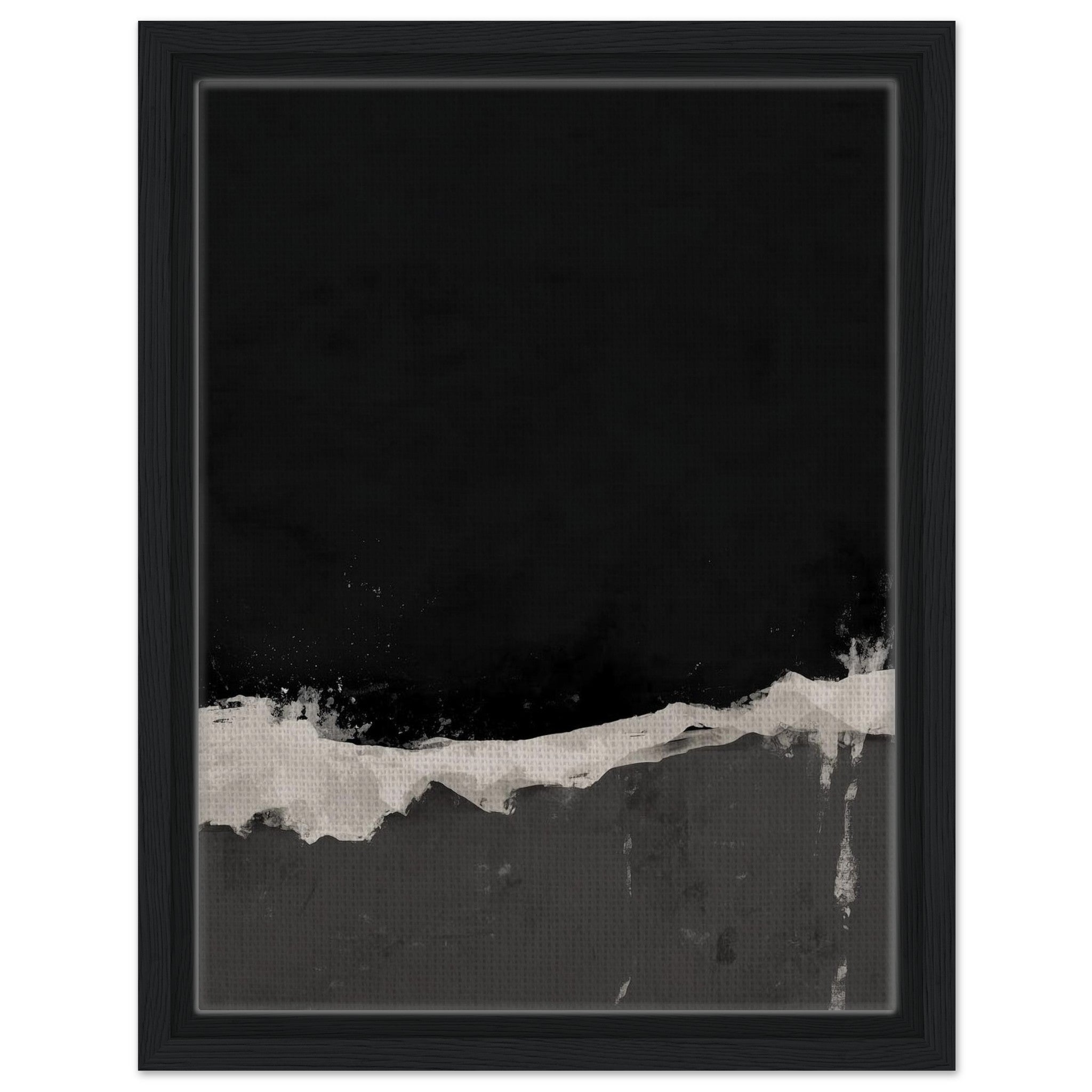 Das Midnight Horizon Leinwandbild zeigt eine dunkle Fläche in Schwarz, die auf eine helle Linie trifft. Darunter liegt eine graue Zone, die Tiefe und Struktur verleiht. Das Motiv erinnert an eine Küste in der Nacht oder an eine stille Landschaft im Mondlicht.