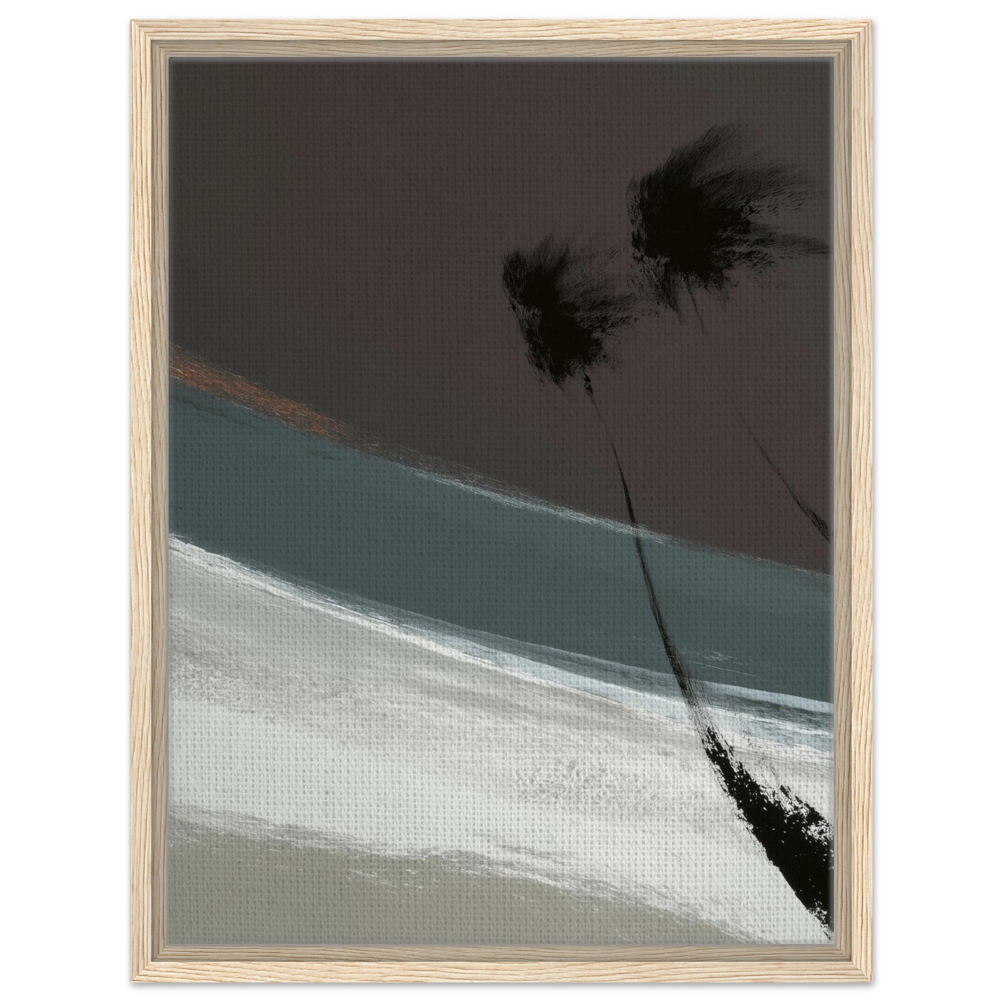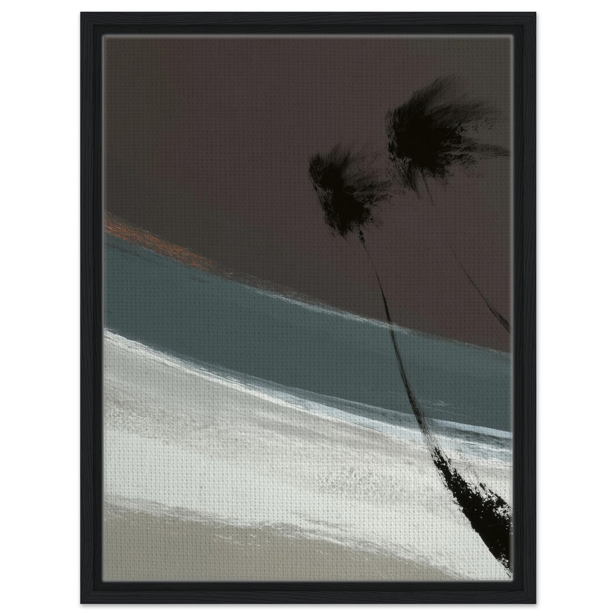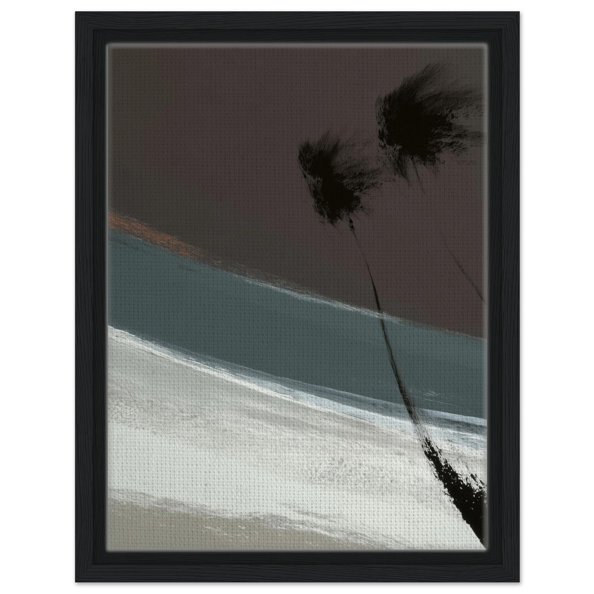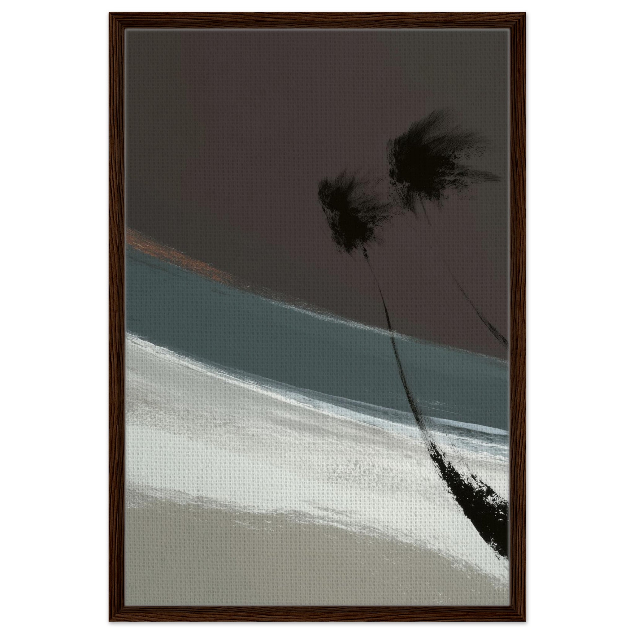 Das Palm Twilight Leinwandbild zeigt eine Küstenszene in Grau, Blau und Violett. Zwei dunkle Palmen ragen in den Himmel und bringen tropisches Flair. Die weichen Übergänge erinnern an den Strand bei Abenddämmerung und geben dem Motiv eine ruhige Stimmung.