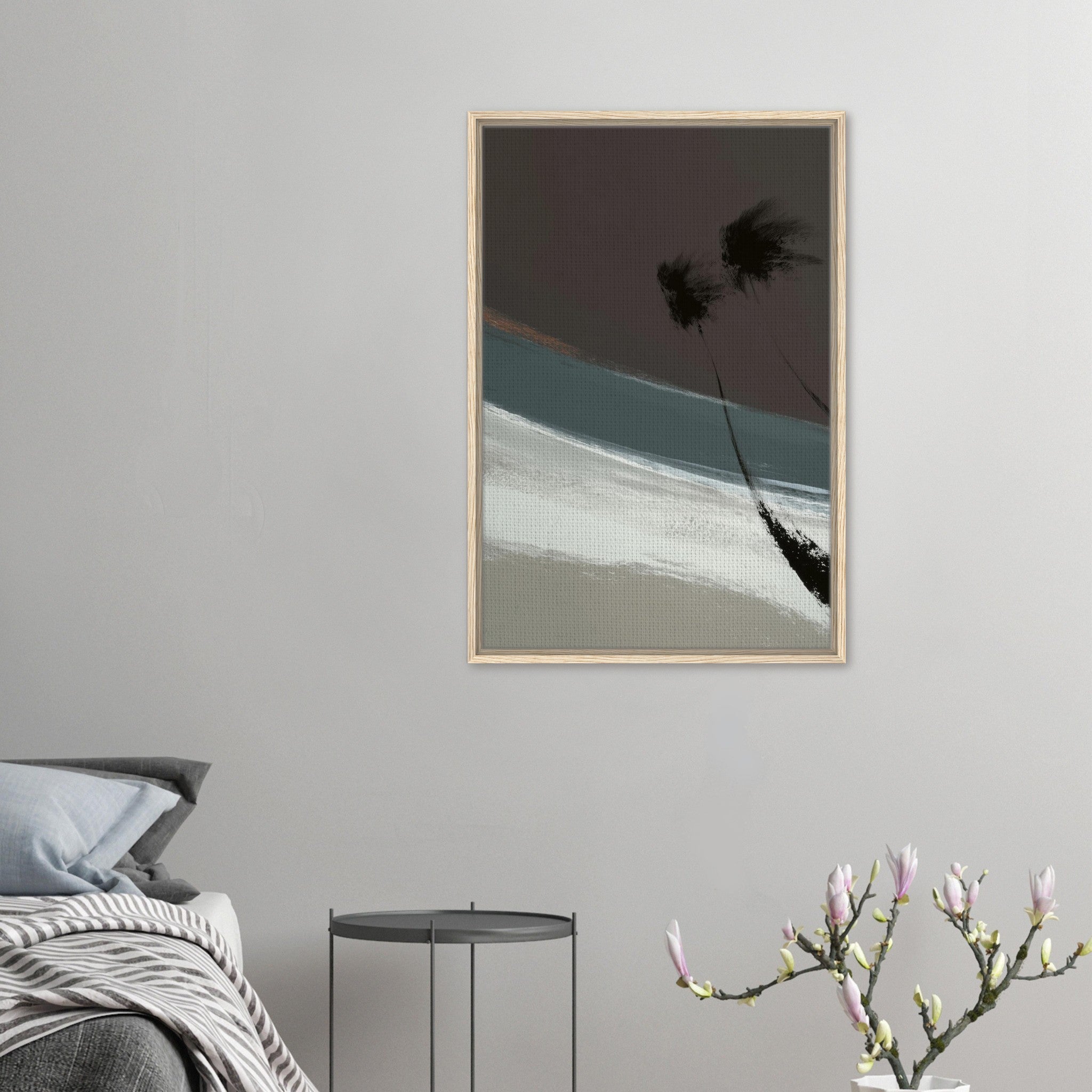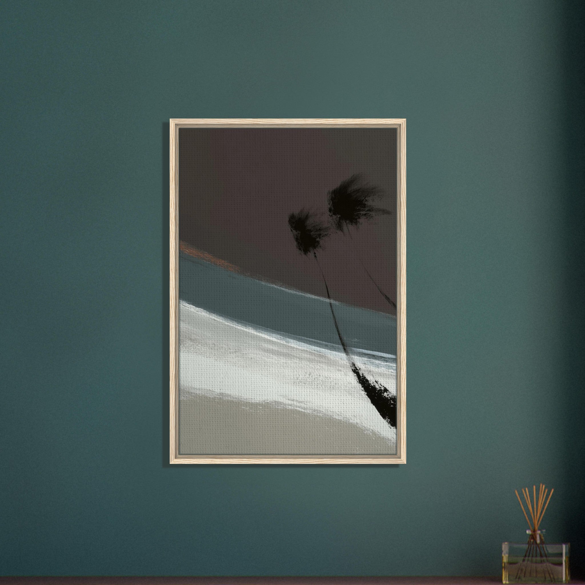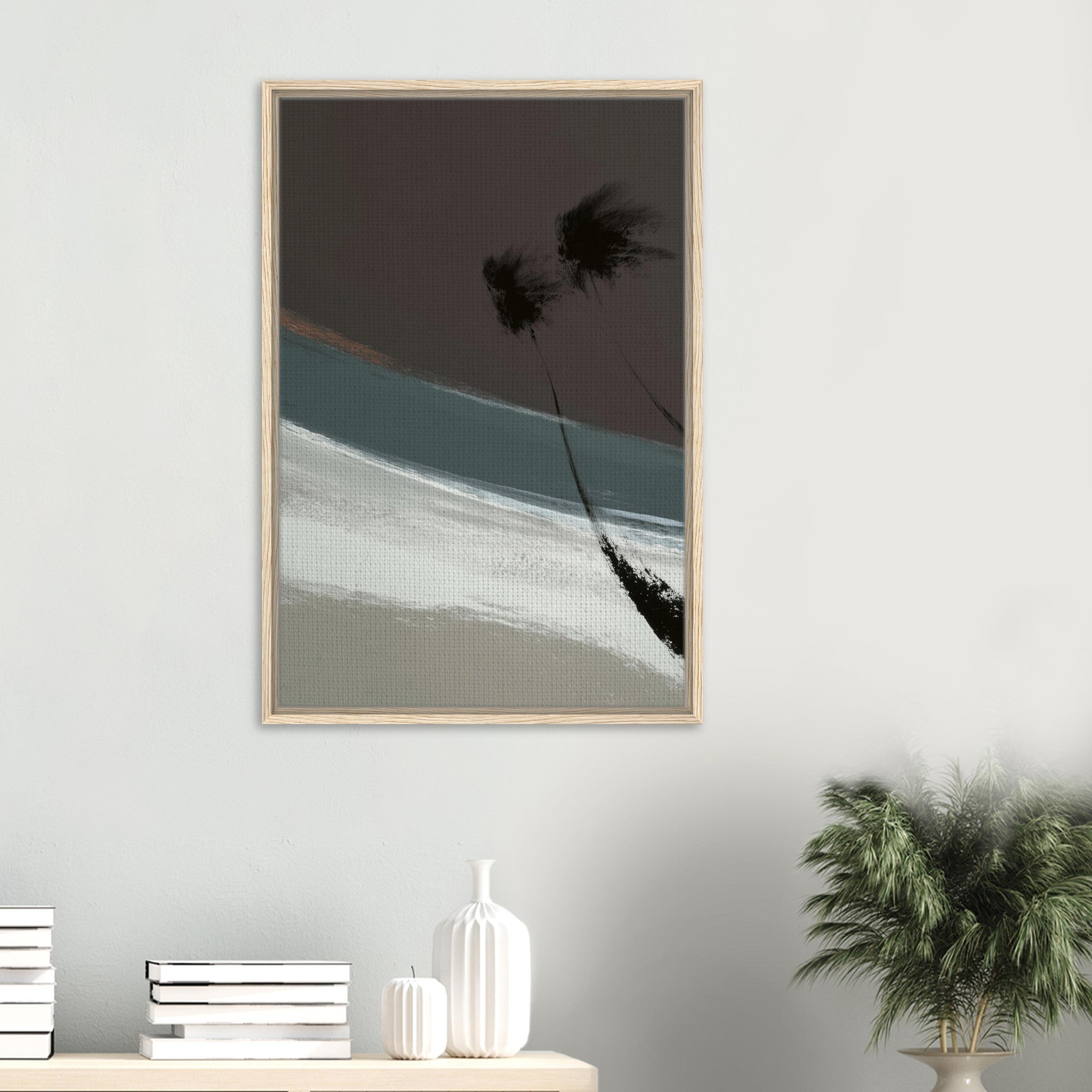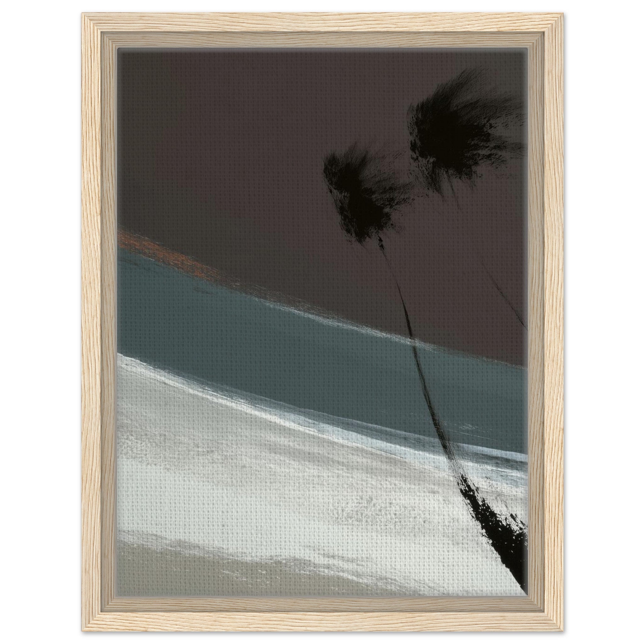 Das Palm Twilight Leinwandbild zeigt eine Küstenszene in Grau, Blau und Violett. Zwei dunkle Palmen ragen in den Himmel und bringen tropisches Flair. Die weichen Übergänge erinnern an den Strand bei Abenddämmerung und geben dem Motiv eine ruhige Stimmung.