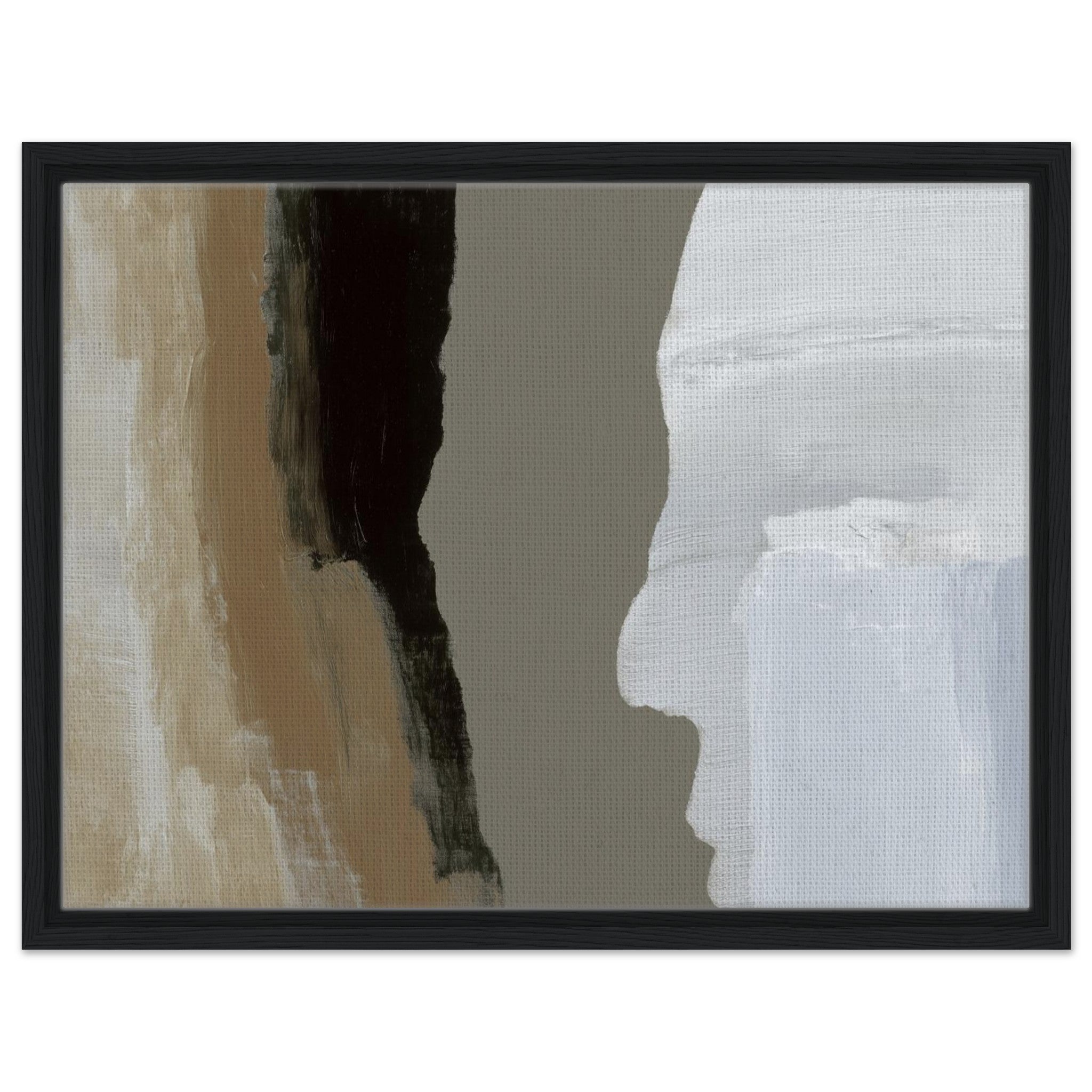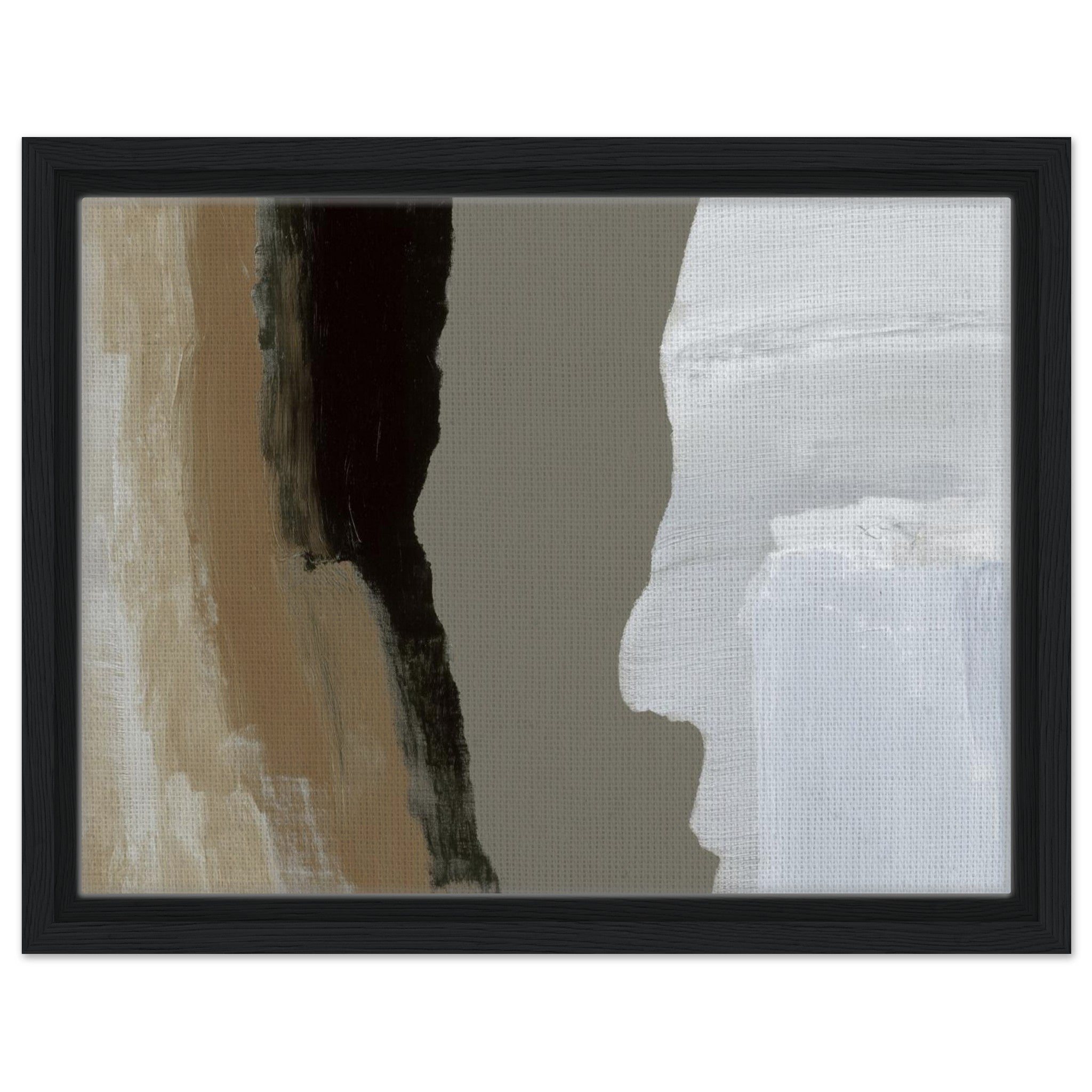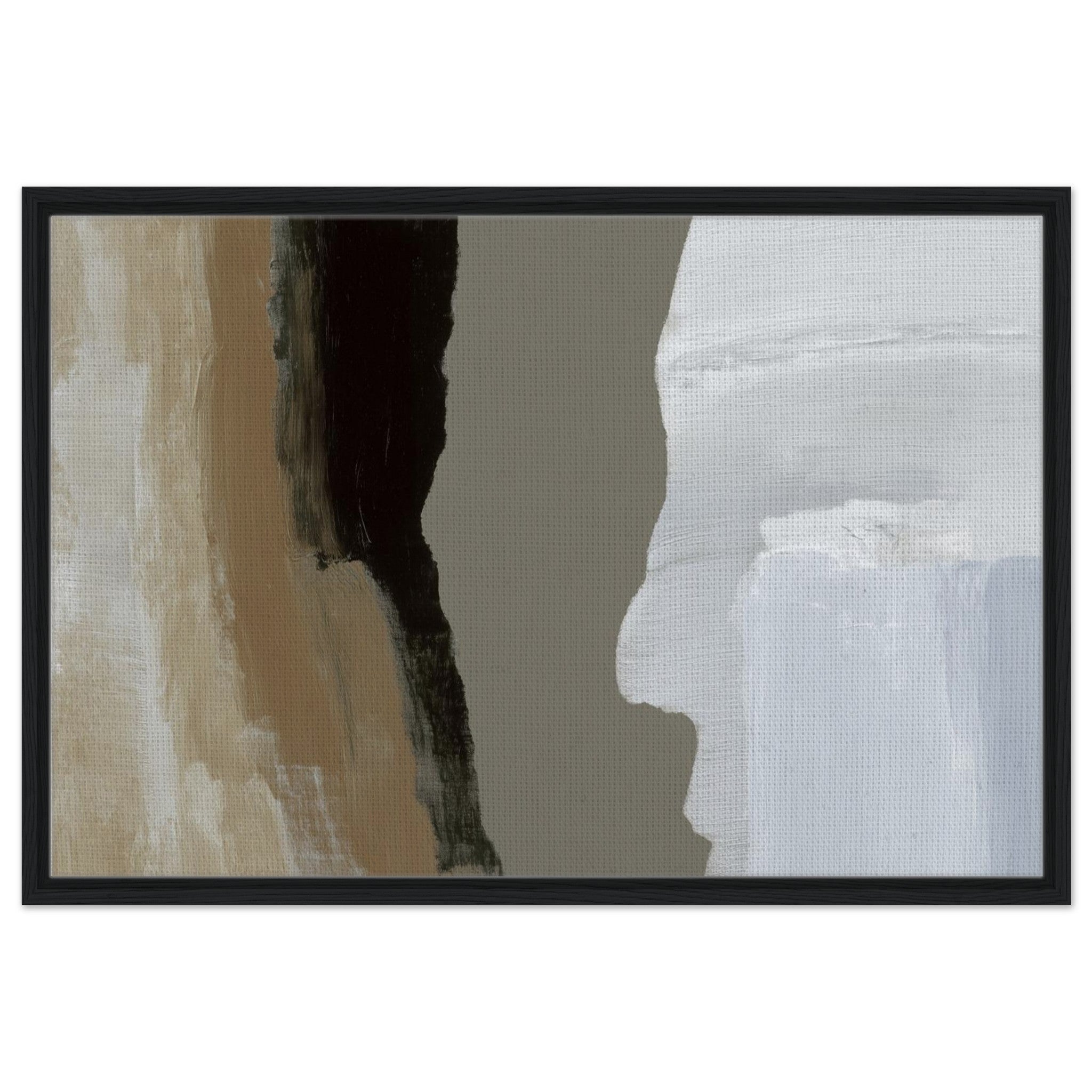 Das Stone Echo Leinwandbild zeigt abstrakte Farbflächen in Beige, Grau, Schwarz und Weiß. Die starken Kontraste erinnern an Gesteinsschichten und Naturformationen. Mit seinen klaren Übergängen und ruhigen Farben wirkt das Bild kraftvoll und gleichzeitig harmonisch.