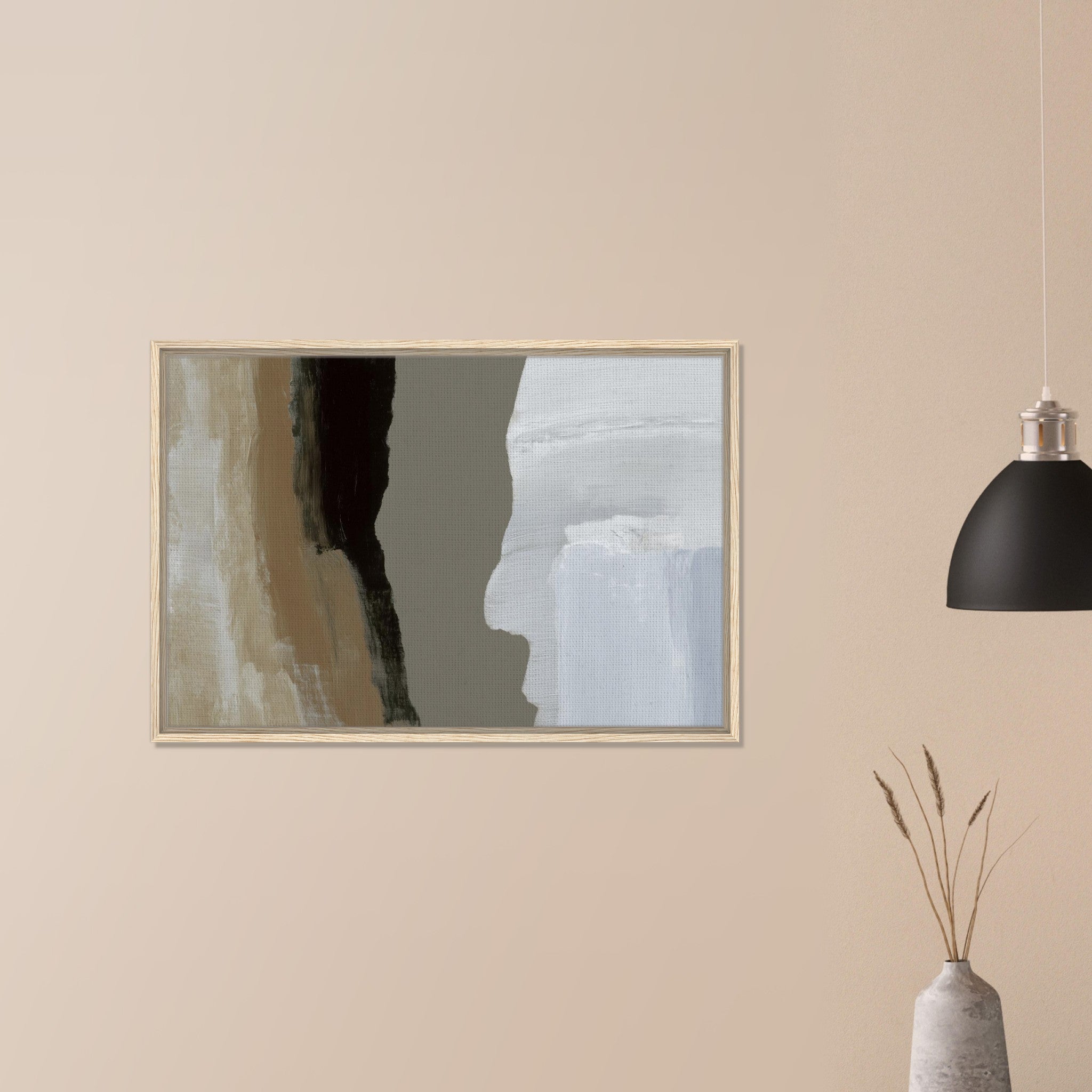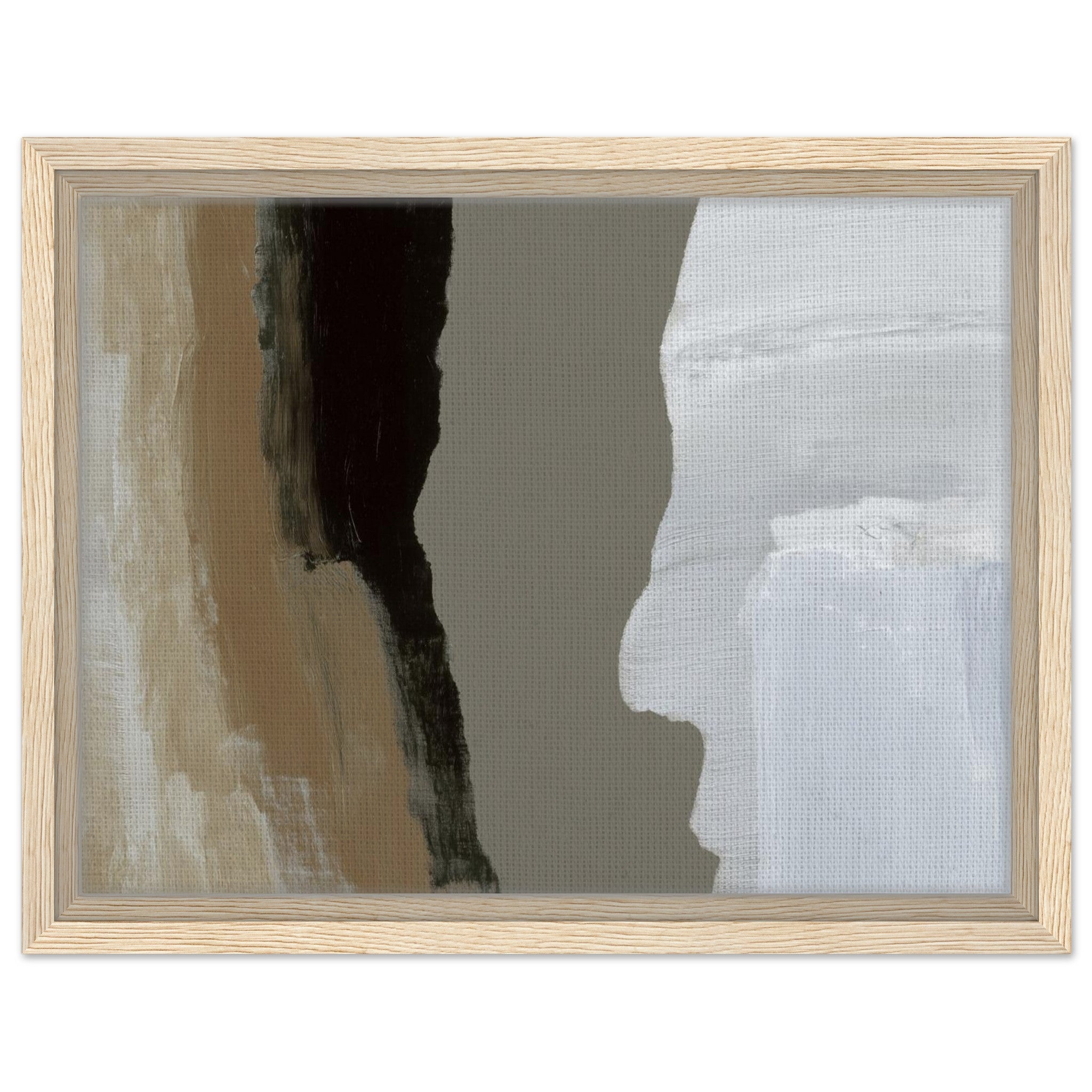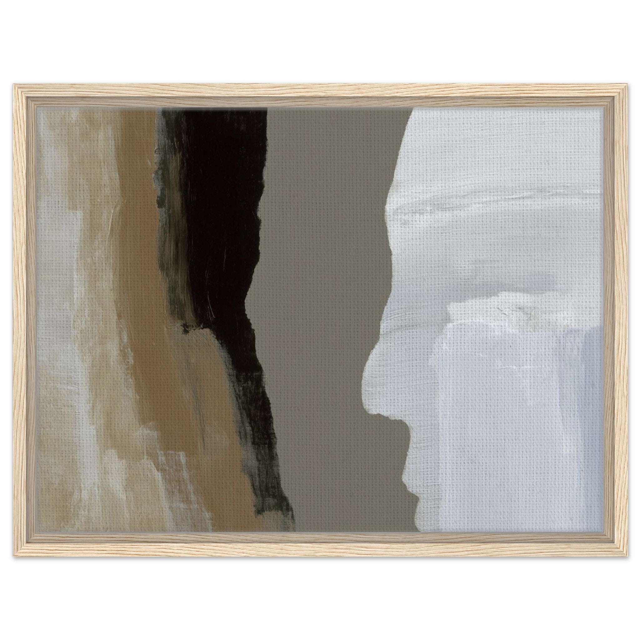 Das Stone Echo Leinwandbild zeigt abstrakte Farbflächen in Beige, Grau, Schwarz und Weiß. Die starken Kontraste erinnern an Gesteinsschichten und Naturformationen. Mit seinen klaren Übergängen und ruhigen Farben wirkt das Bild kraftvoll und gleichzeitig harmonisch.
