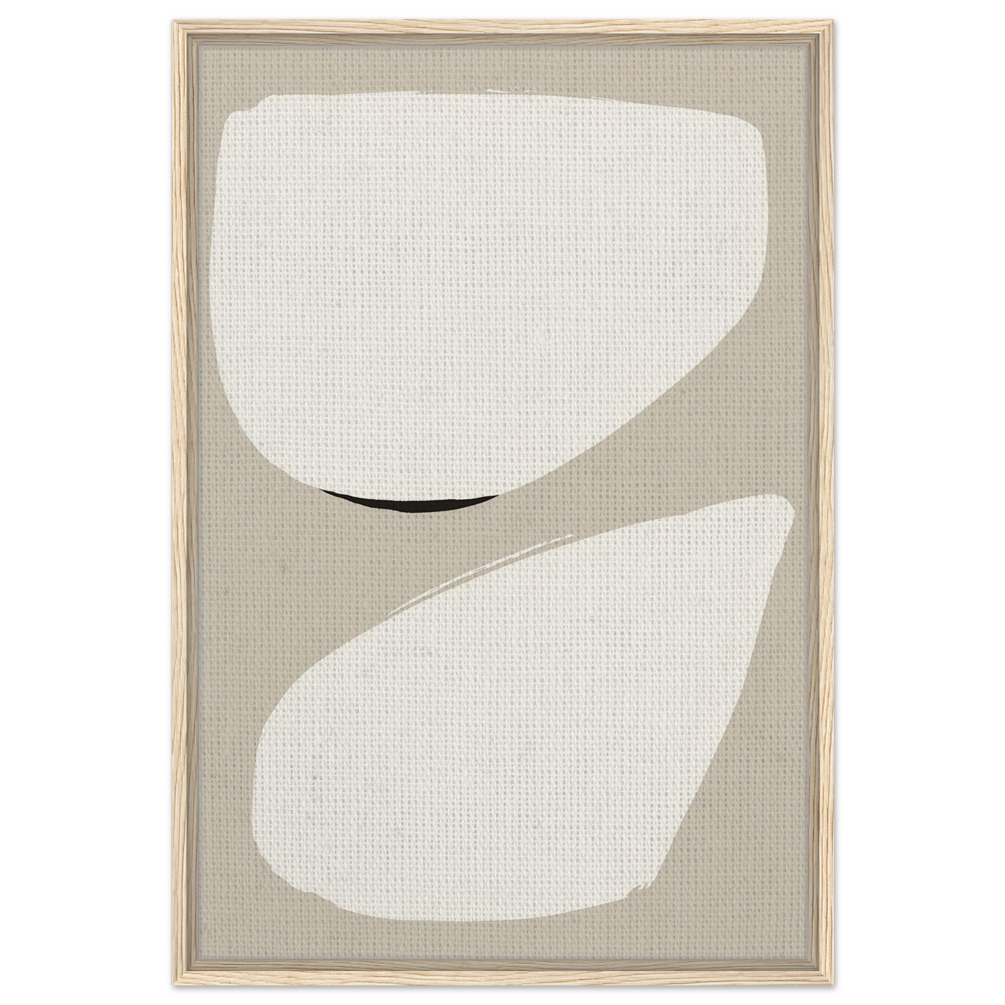 Das White Petals Leinwandbild zeigt zwei helle, organische Formen, die an zarte Blütenblätter erinnern. Auf dem beigen Hintergrund wirken die weißen Flächen leicht und luftig, während kleine schwarze Akzente Tiefe und Spannung hinzufügen. Das Motiv verbindet florale Inspiration mit moderner Abstraktion.