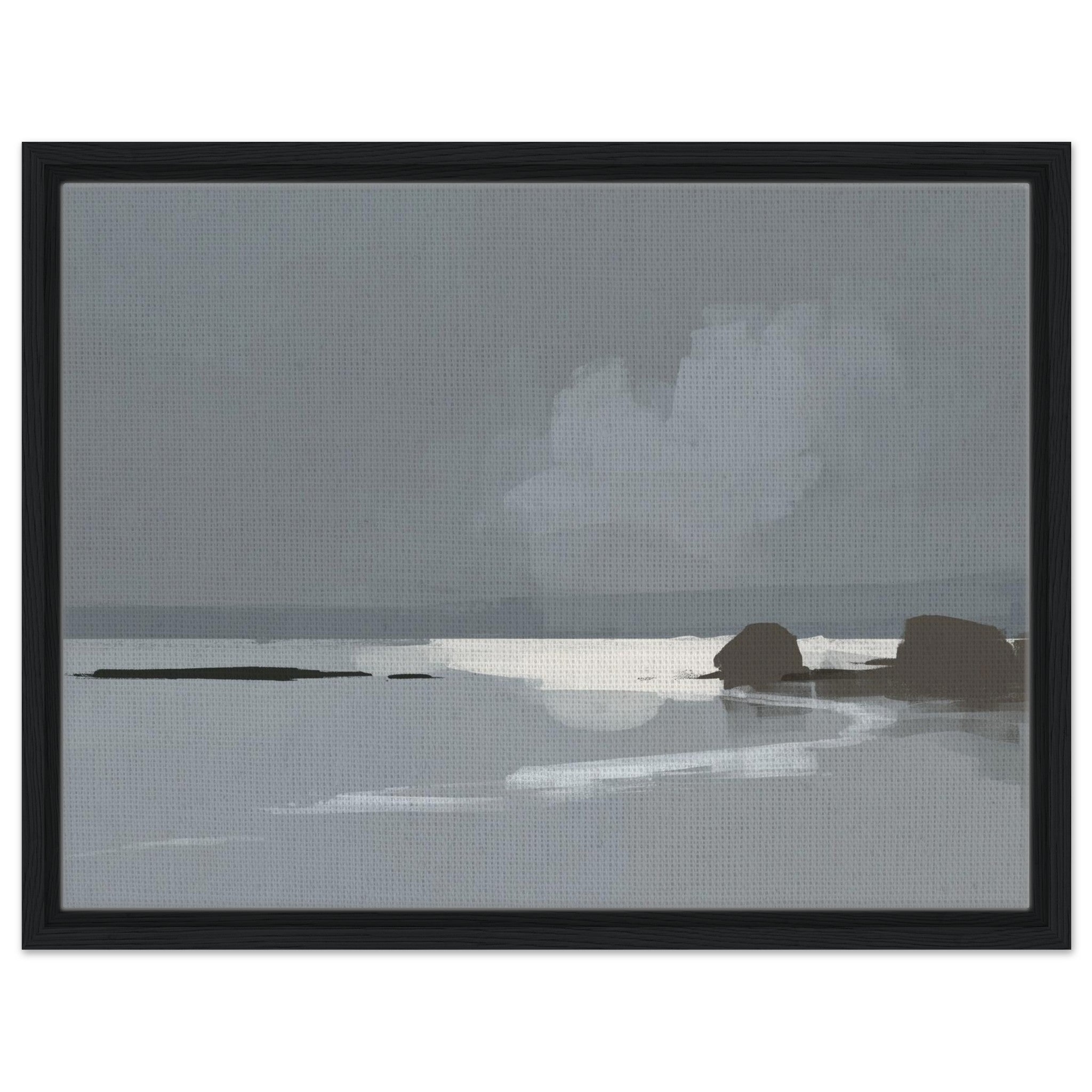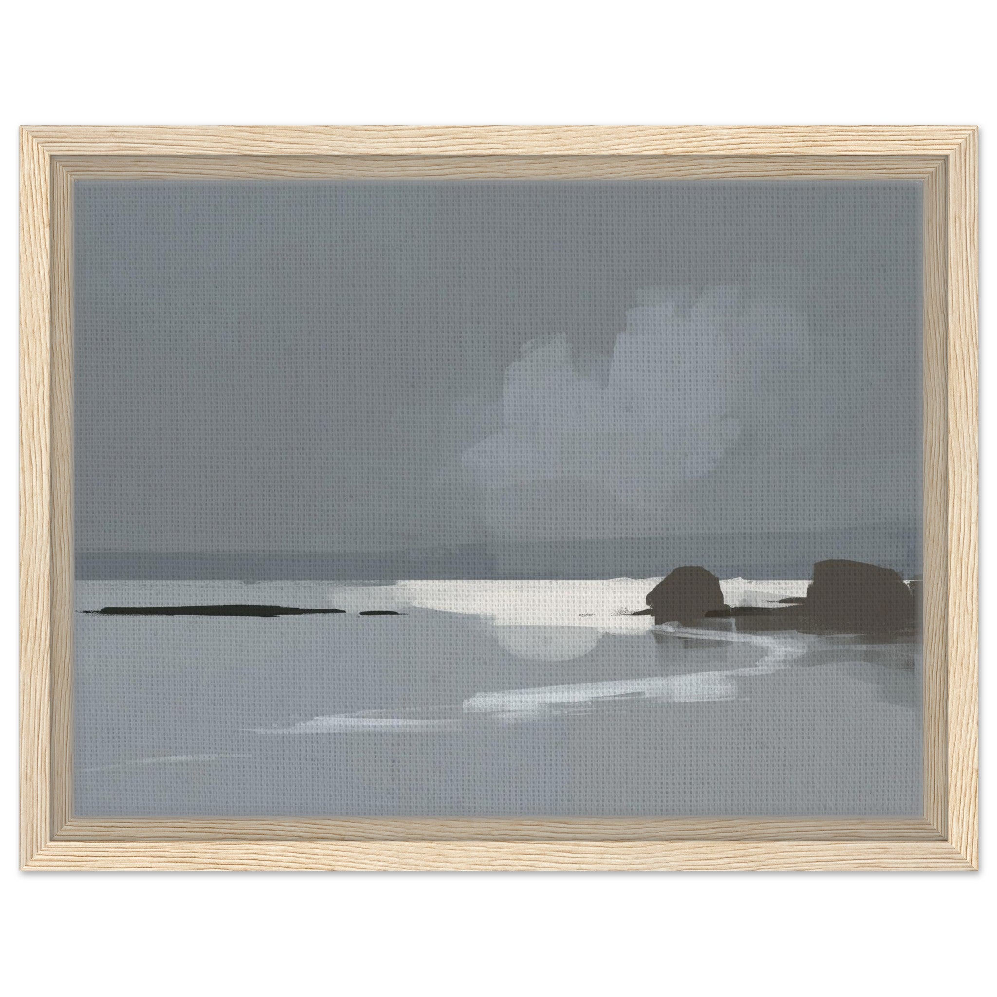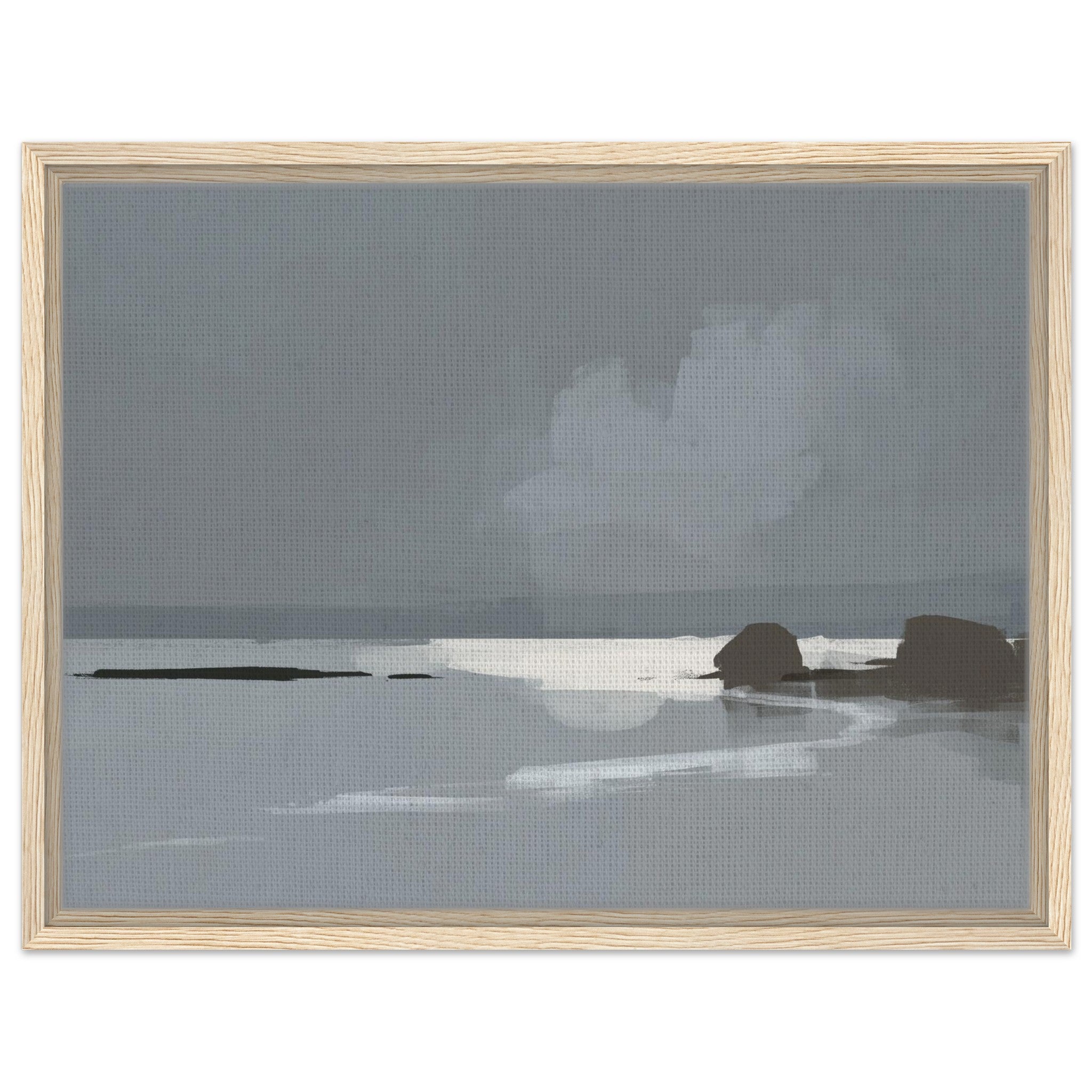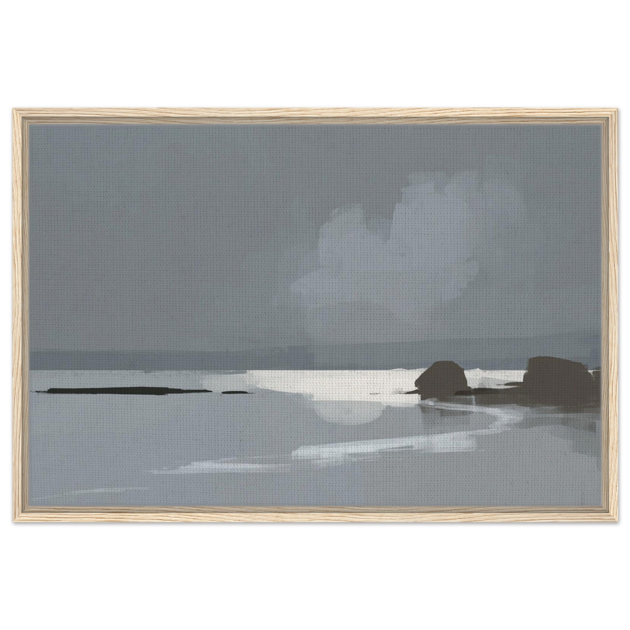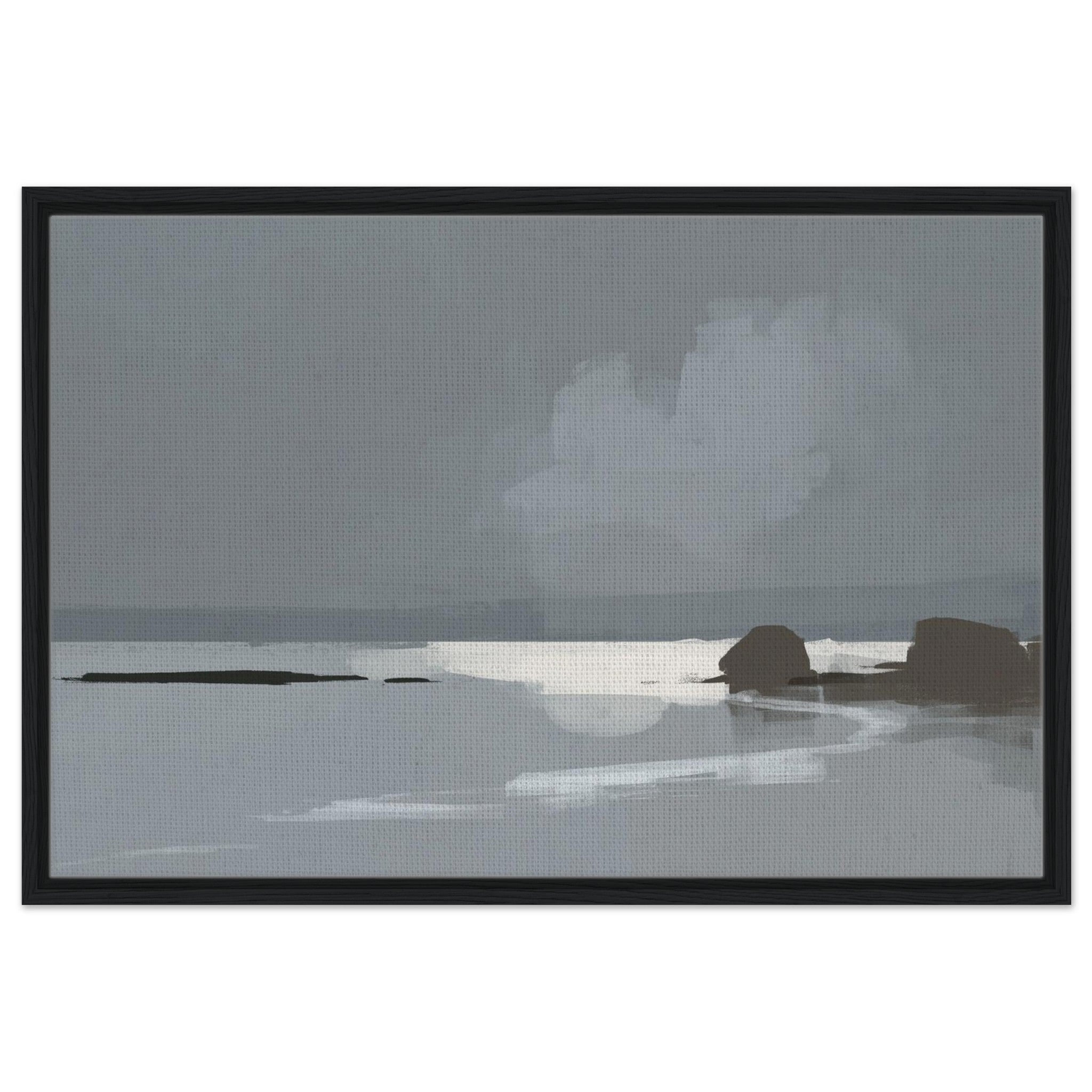 Das Calm Shore Leinwandbild zeigt eine ruhige Küstenlandschaft in sanften Grau- und Blautönen. Licht spiegelt sich im Wasser, während weiche Wolken und dunkle Felsen den Blick auf den Horizont lenken. Die Szene wirkt minimalistisch und bringt sofort eine entspannte Stimmung in den Raum.