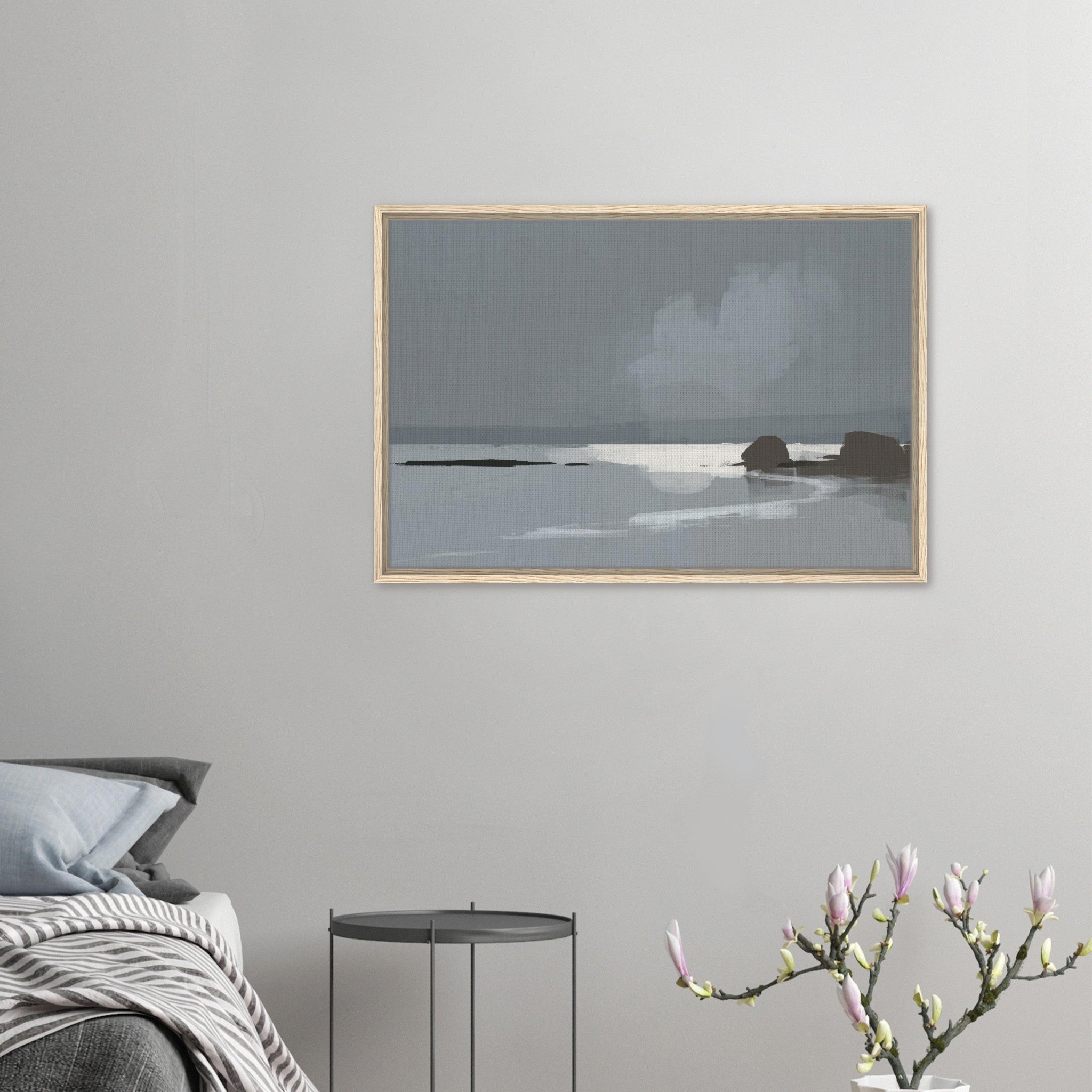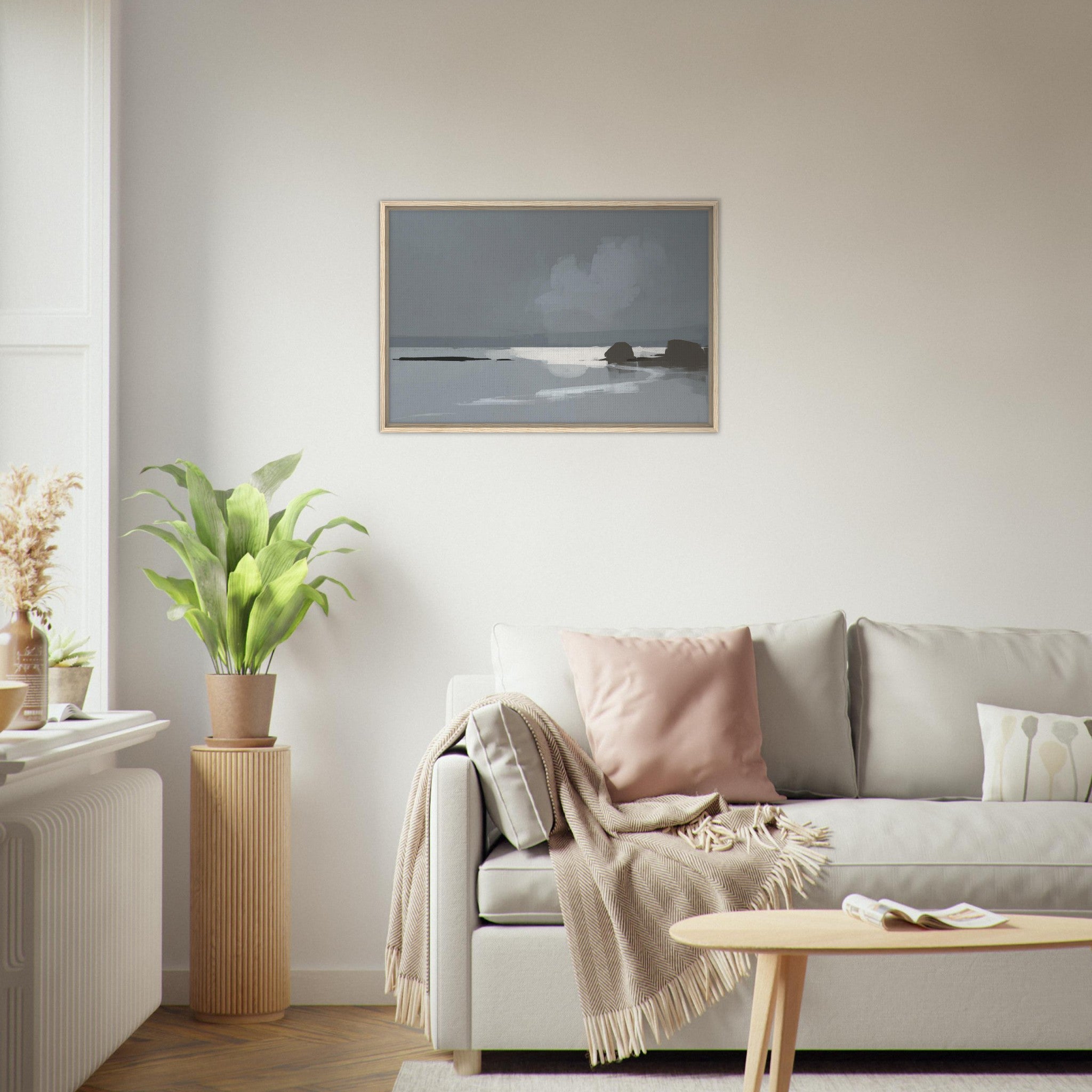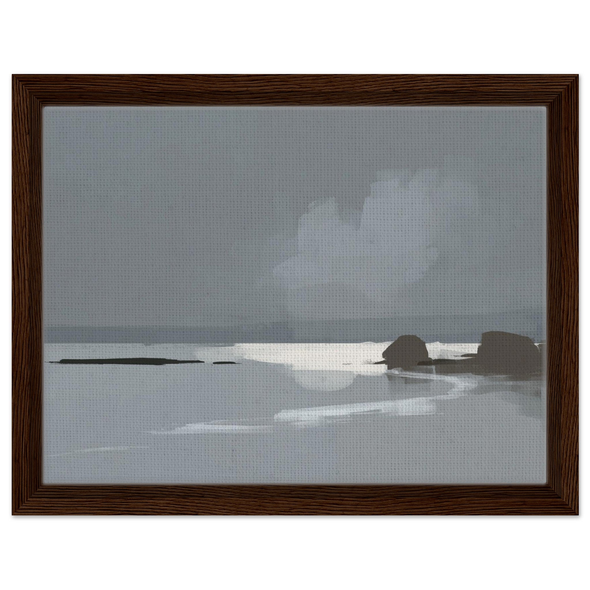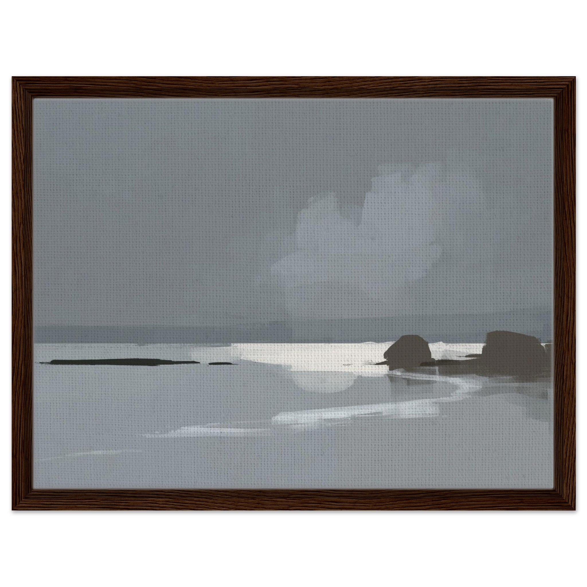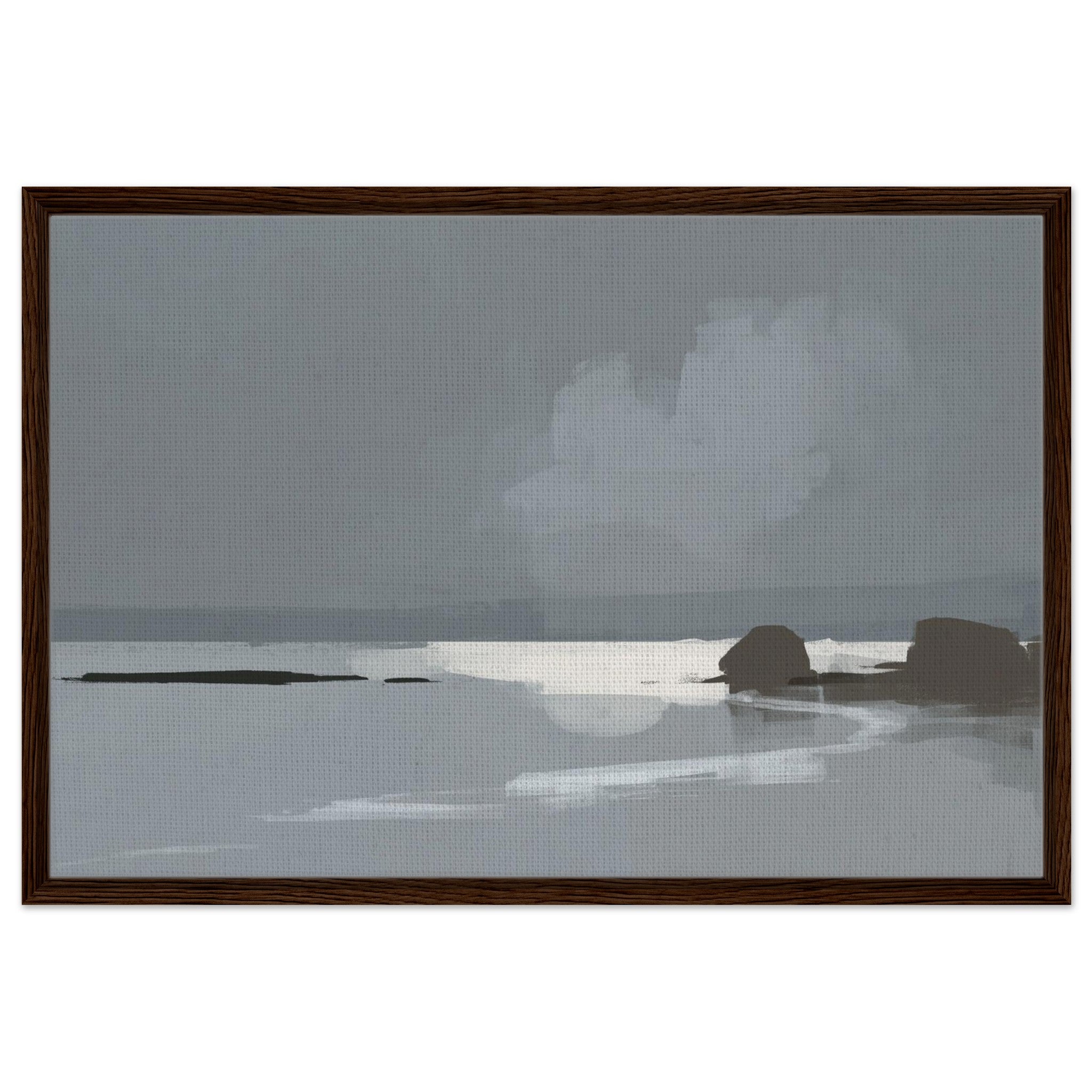 Das Calm Shore Leinwandbild zeigt eine ruhige Küstenlandschaft in sanften Grau- und Blautönen. Licht spiegelt sich im Wasser, während weiche Wolken und dunkle Felsen den Blick auf den Horizont lenken. Die Szene wirkt minimalistisch und bringt sofort eine entspannte Stimmung in den Raum.
