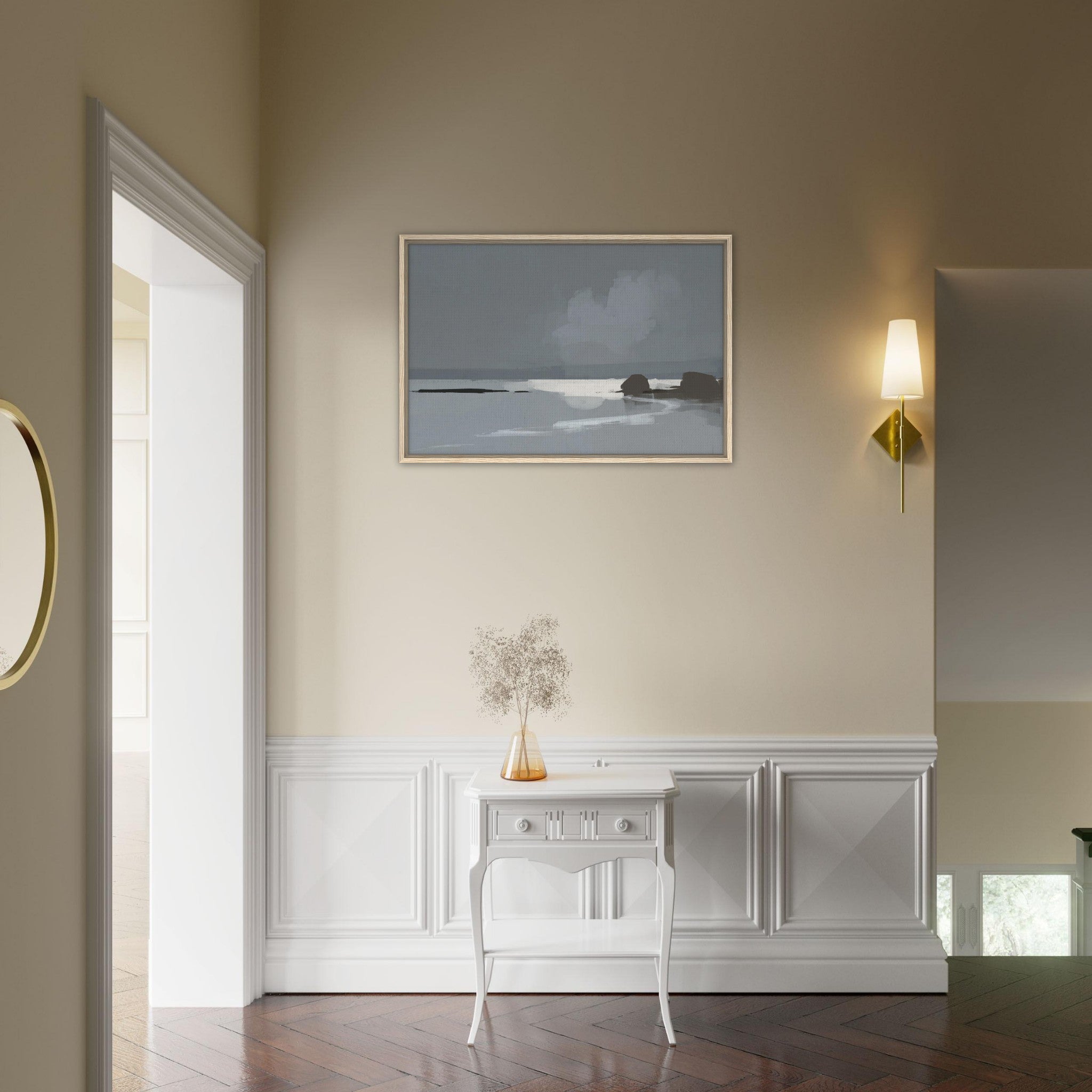 Hänge dieses Leinwandbild ins Wohnzimmer und schaffe eine Atmosphäre der Gelassenheit. Verwandle dein Schlafzimmer in einen Ort der Ruhe oder setze im Büro einen stillen, stilvollen Akzent. Die schlichten Farben lassen sich leicht kombinieren und passen zu modernen wie klassischen Einrichtungsstilen.