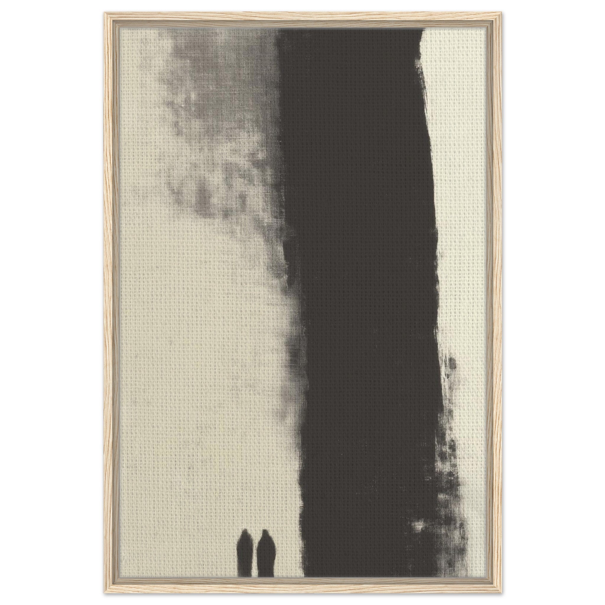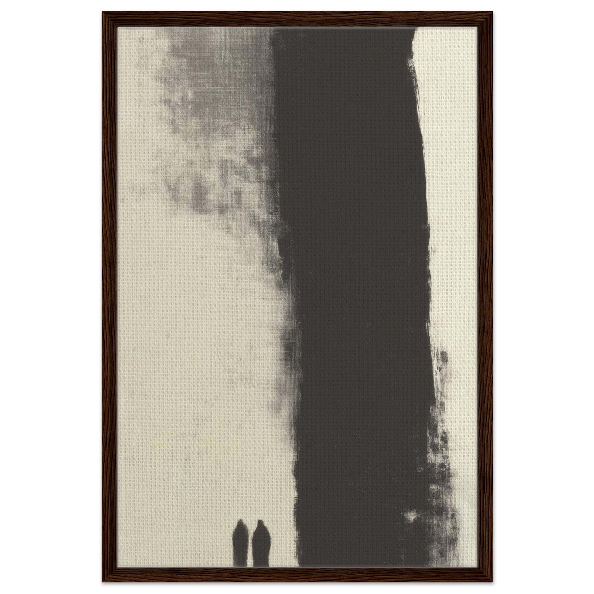 Das Silent Journey Leinwandbild zeigt zwei kleine Figuren am Fuß eines hohen schwarzen Streifens. Der helle Hintergrund verstärkt den Kontrast und macht das Motiv eindrucksvoll. Das Bild erinnert an eine Reise, einen Aufbruch oder an den Weg durch eine monumentale Landschaft.
