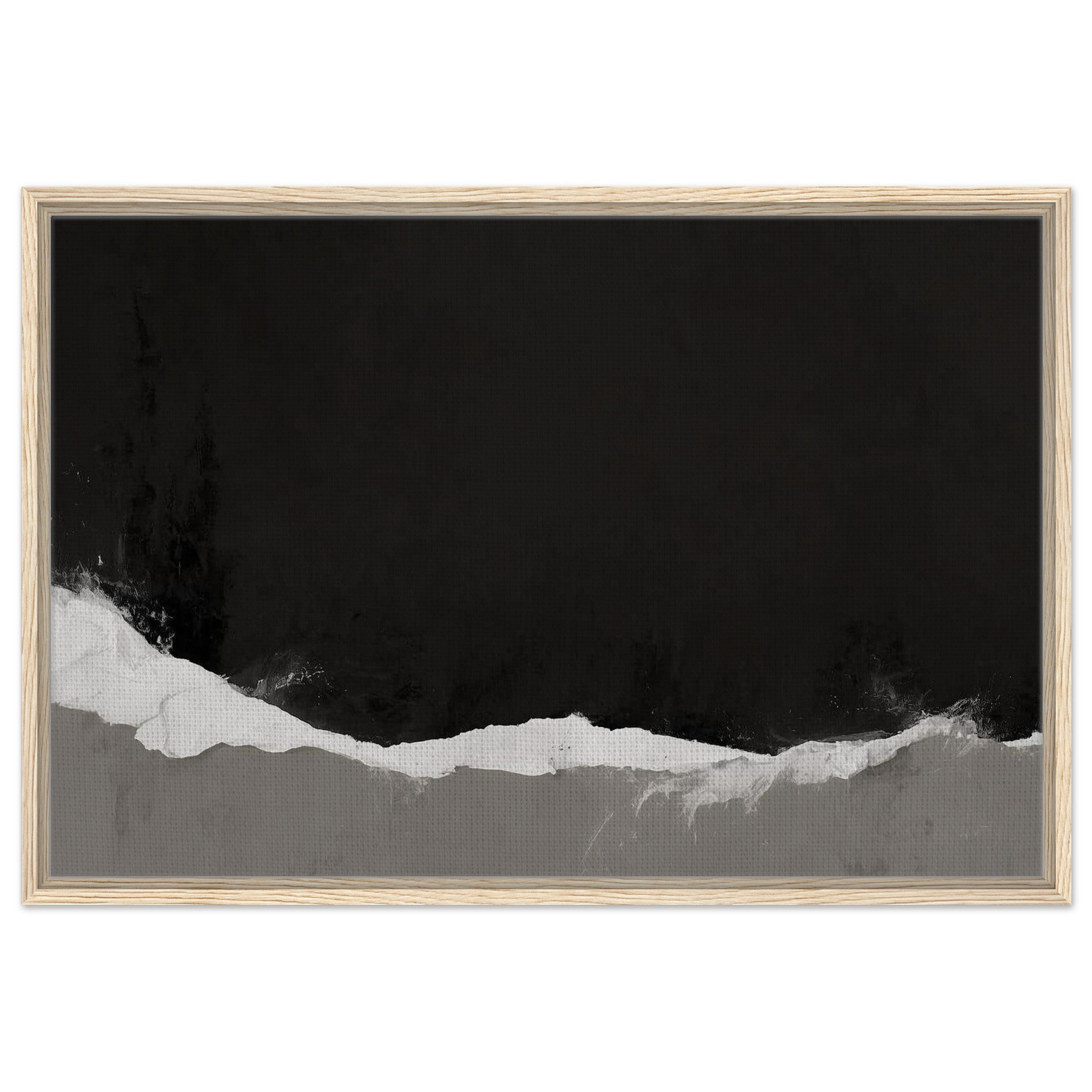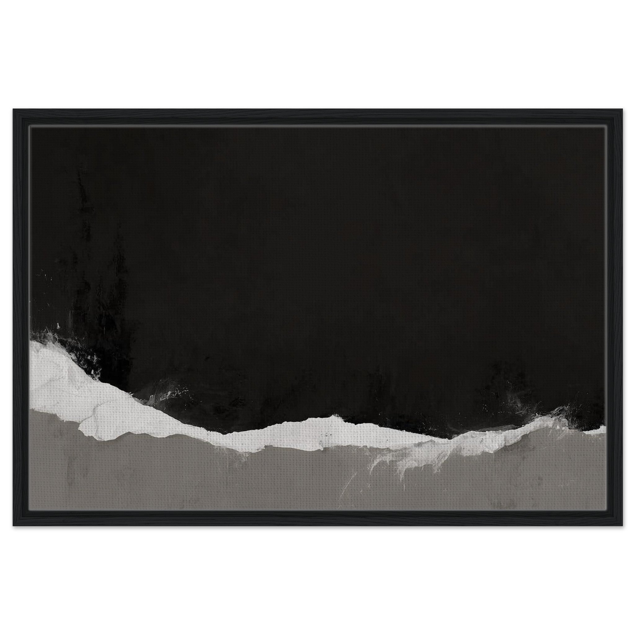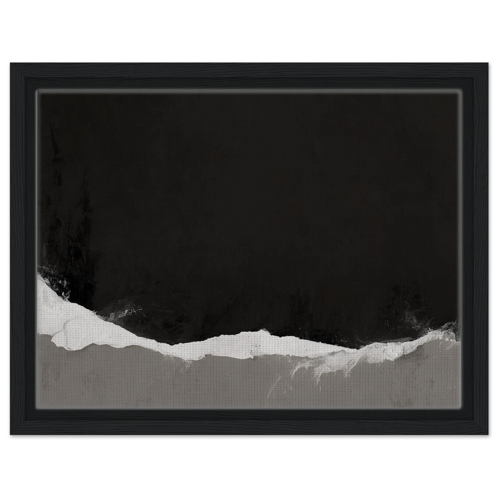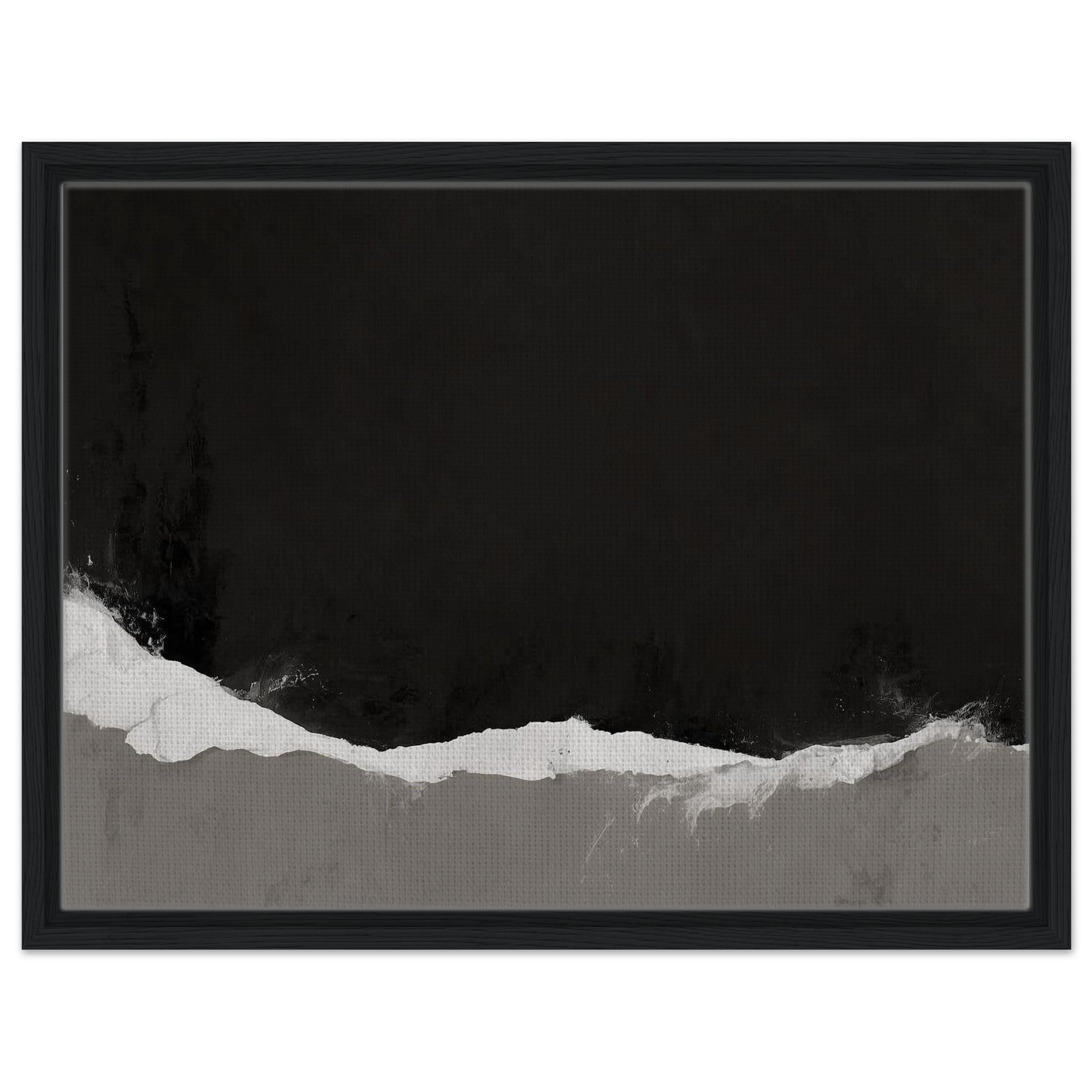 Das Torn Horizon Leinwandbild fängt die rohe Schönheit von Natur und Landschaft auf abstrakte Weise ein. Ein dunkler, fast schwarzer Himmel trifft auf eine unregelmäßige weiße Linie, die wie eine aufgerissene Küste wirkt. Darunter liegt eine ruhige graue Fläche, die Tiefe und Gelassenheit ausstrahlt.