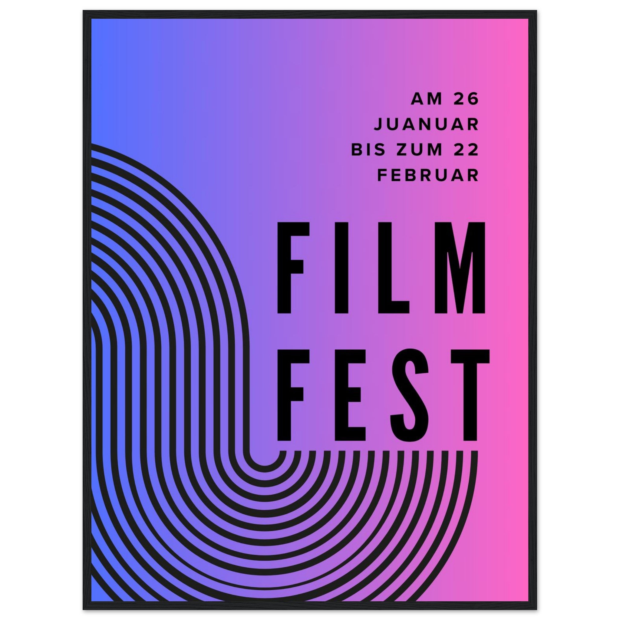 Infuse your space with a jolt of modern energy! This striking framed poster features a dynamic ombre gradient transitioning from cool blues to hot pinks, accented by bold, contemporary black typography and an eye-catching striped arc design. It's the perfect statement piece for film enthusiasts, art lovers, or anyone looking to add a touch of abstract sophistication to their home or office.