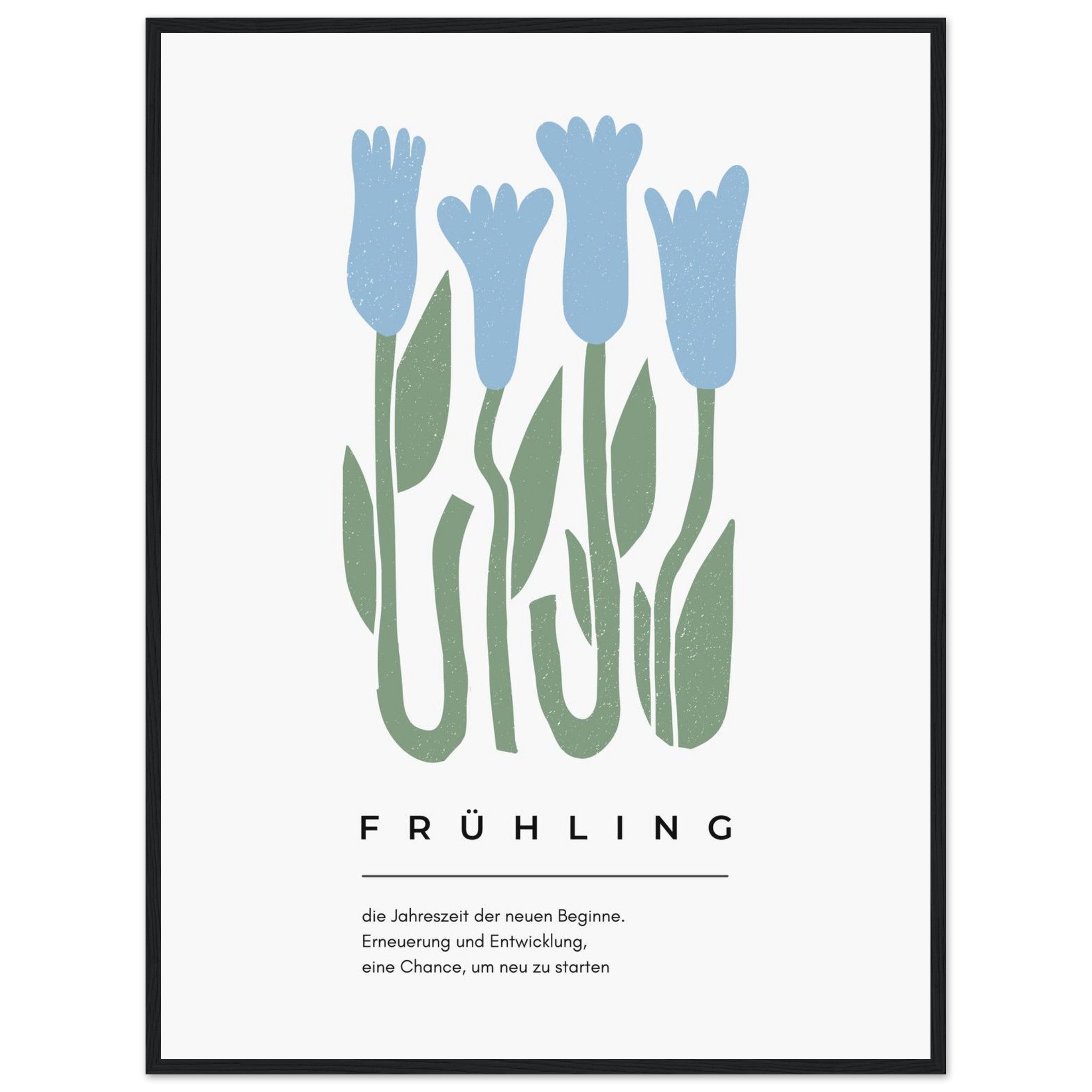 Embrace the refreshing spirit of new beginnings with our “Frühling” (Spring) framed poster. Featuring a charming, abstract design of serene blue flowers and vibrant green stems, this piece captures the essence of spring's renewal and growth. The delicate, textured finish on the matte paper brings a contemporary touch to any space, making it perfect for those who appreciate minimalist art with a heartfelt message.