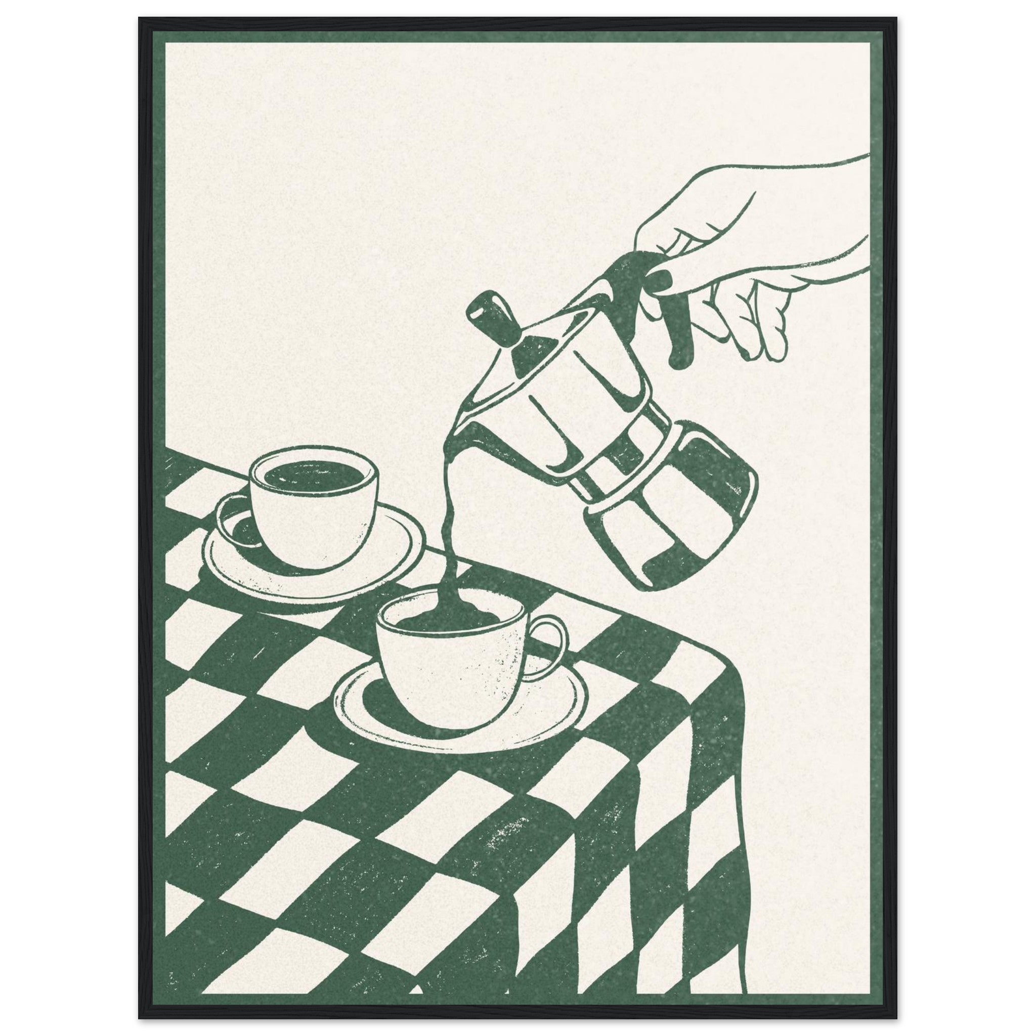 Savor the simple elegance of a perfect coffee moment with our Retro Coffee Pour framed poster. This charming art print, featuring a stylish hand pouring from a classic moka pot onto a chic checkered tablecloth, evokes the cozy, timeless ritual of sharing a cup. The vintage-inspired line art and soothing green and cream palette bring a touch of nostalgic sophistication and warmth to any kitchen, dining nook, or office space.